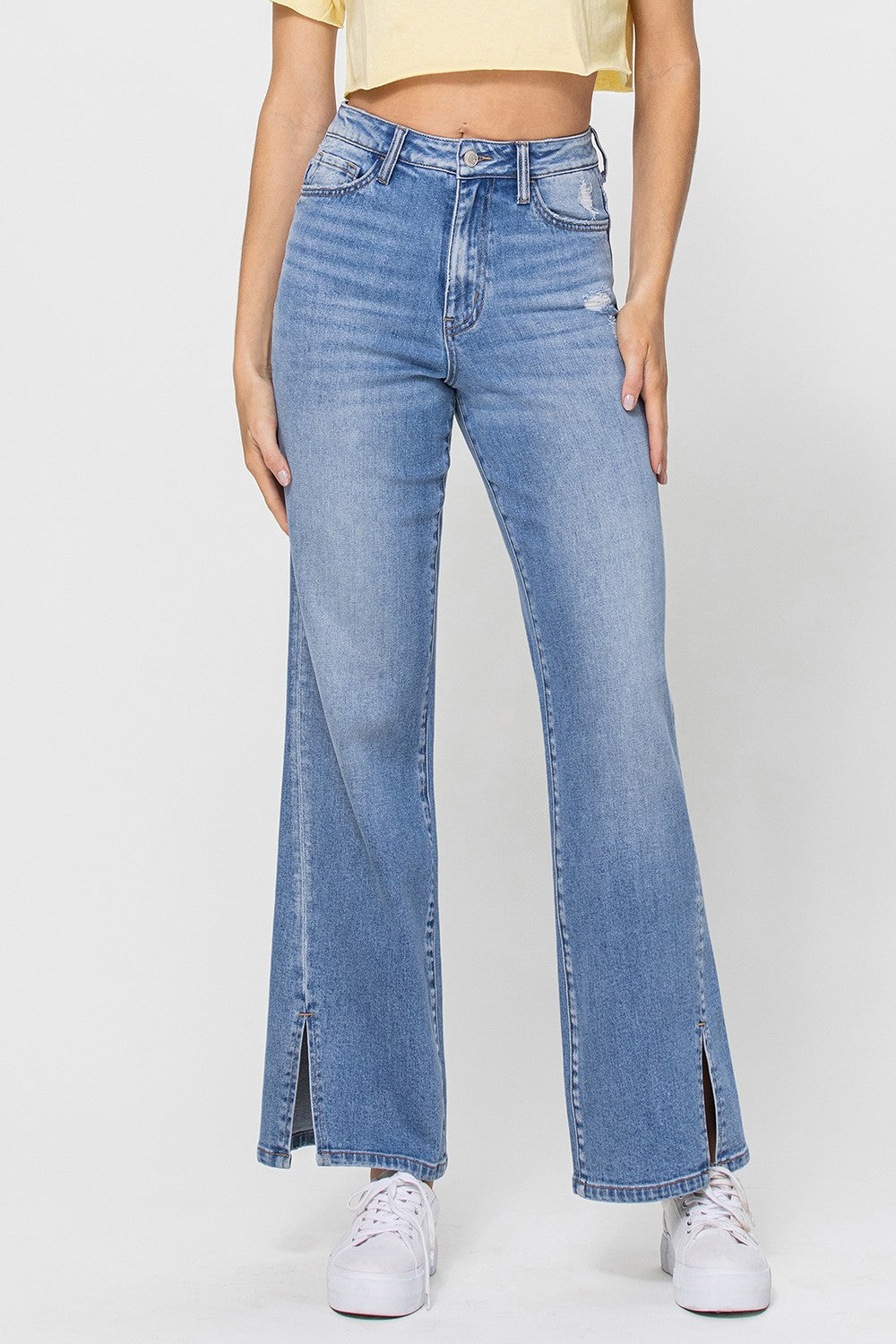 Go back to the future with these vintage-inspired flare jeans! Made from comfy stretch denim, they feature a super high rise waist and trendy distressed details. The out seam slit hem adds a unique touch. With a full length and 20" leg opening, these jeans will elevate your style to the max!