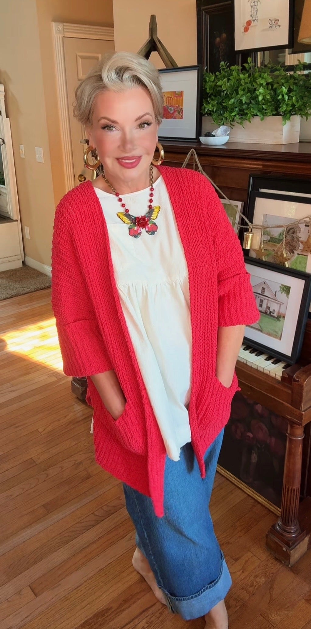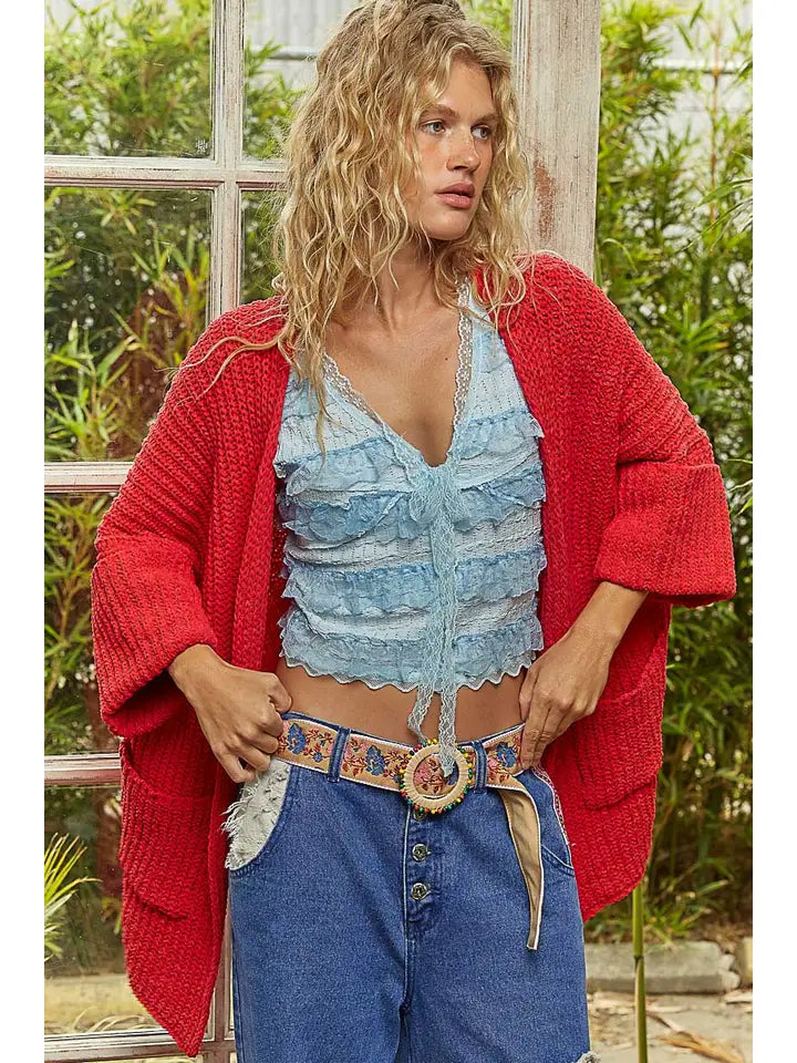 Wrap yourself in cozy style with the All Eyes on You Cardigan. This oversized, apple red knitted cardigan offers both warmth and a bold pop of color to your wardrobe. Featuring convenient side pockets, it combines comfort with practicality, making it perfect for layering on chilly days. Stand out effortlessly while staying snug and stylish.