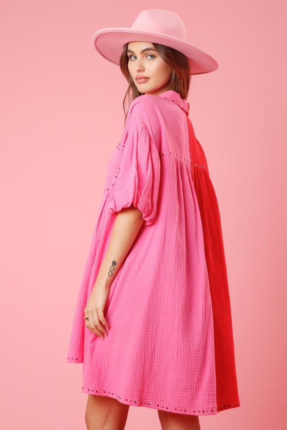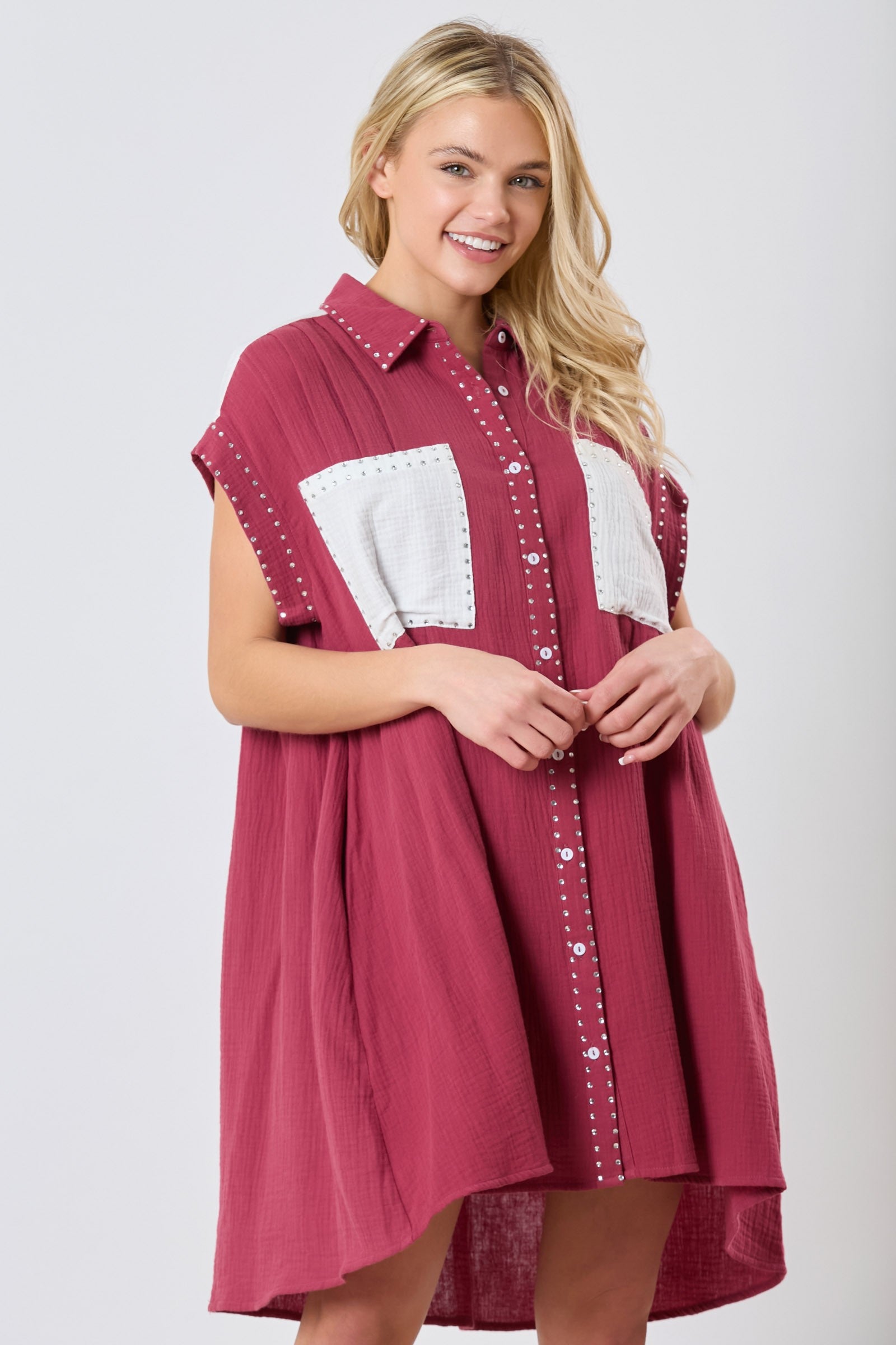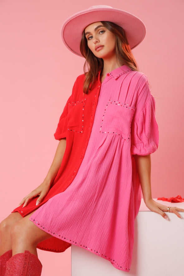 Introducing our Back on the Block Dress! This collared dress features short puff sleeves, a gathered back, and pleats for a flattering fit. The multicolor rhinestone detailing adds a touch of sparkle, while pockets on the chest provide convenience. Elevate your style with this chic and versatile dress.