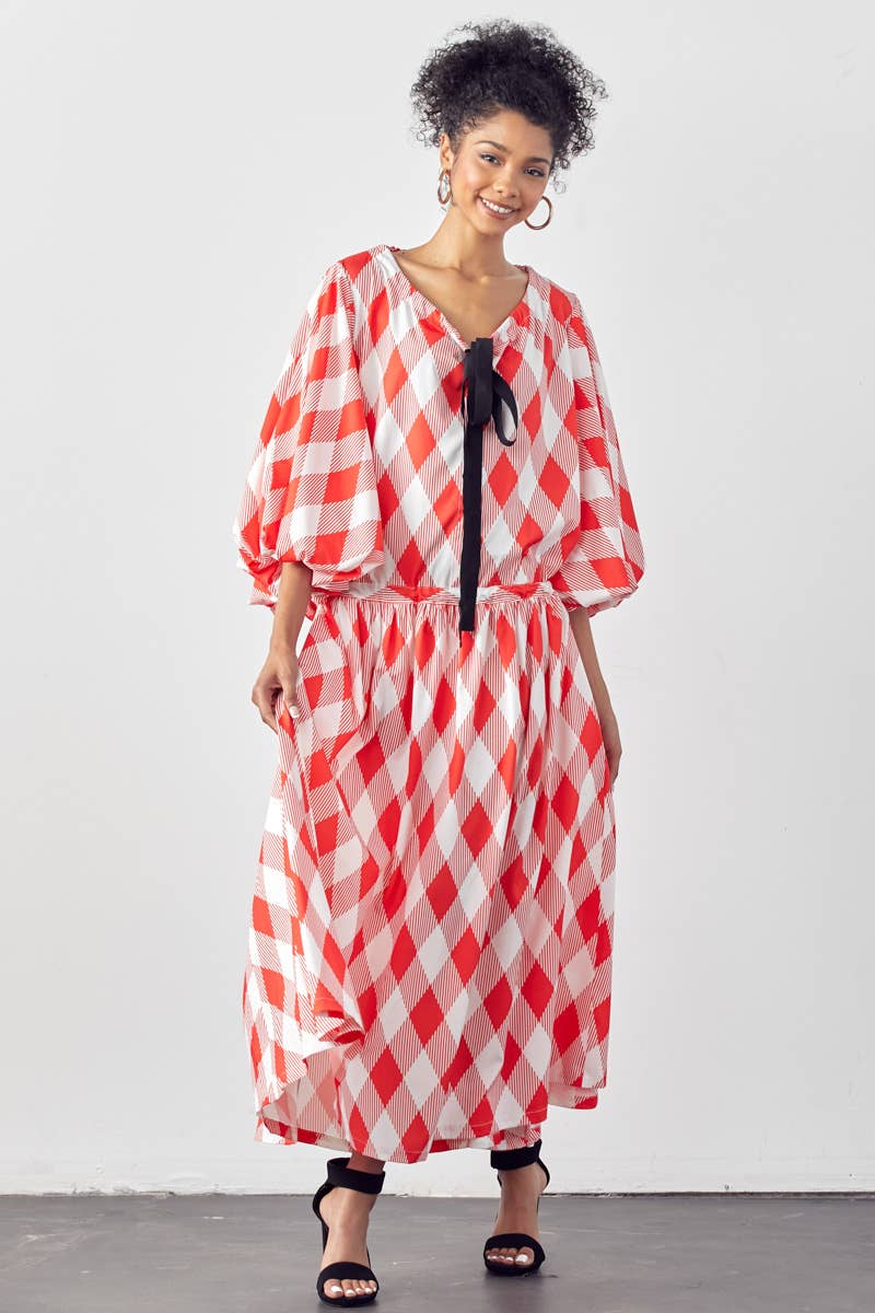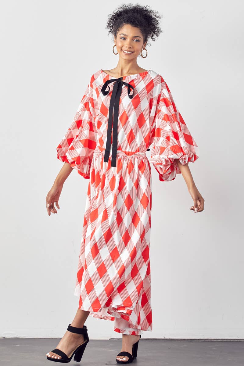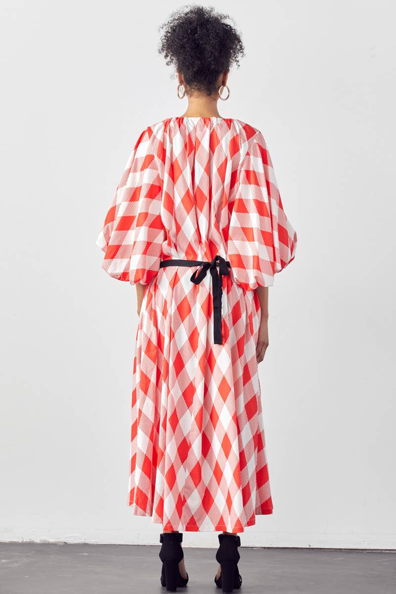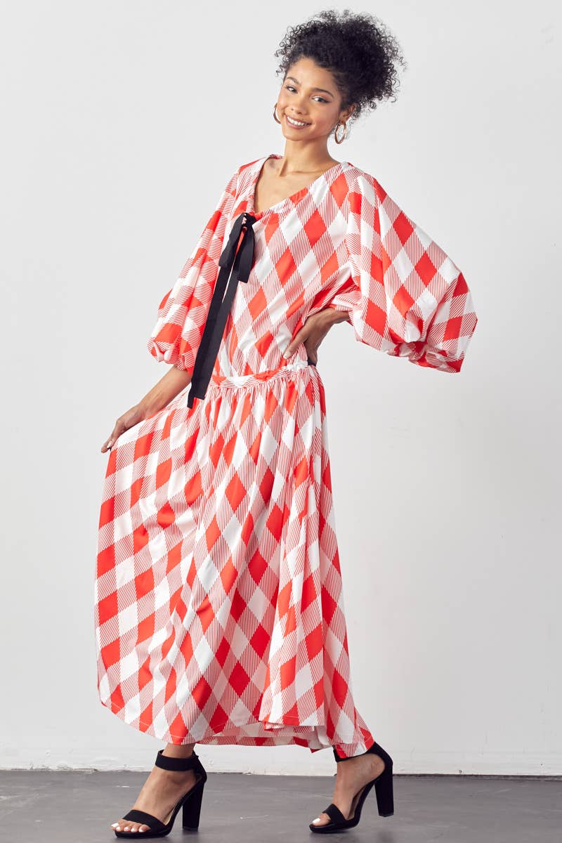BALLOON SLEEVE DRESS WITH POCKETS -SELF TIE BOW -OVERFITTING STYLE -ADJUSTABLE WAIST -EXTRA WIDE A-LINE -POCKETS -MAXI LENGTH -SIZE DOWN, RUNS VERY GENEROUS! The model is 5'9 and is wearing a size Small