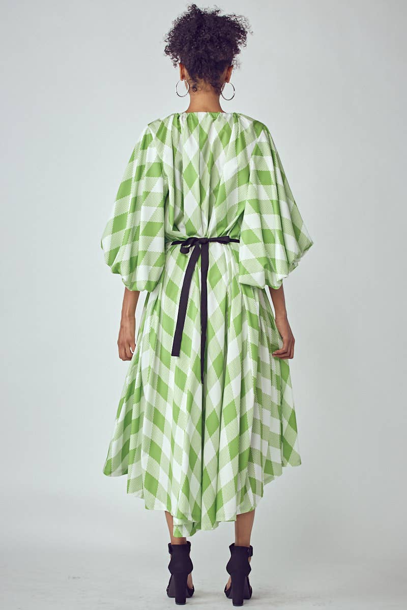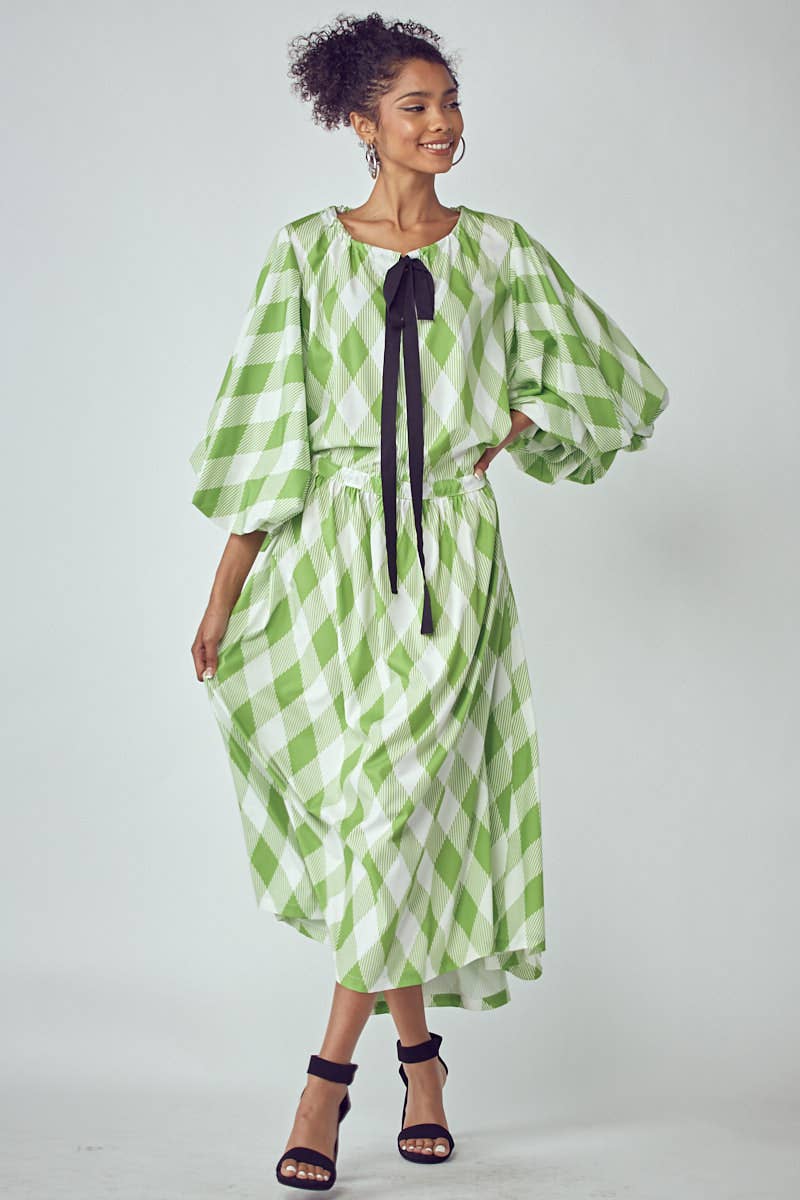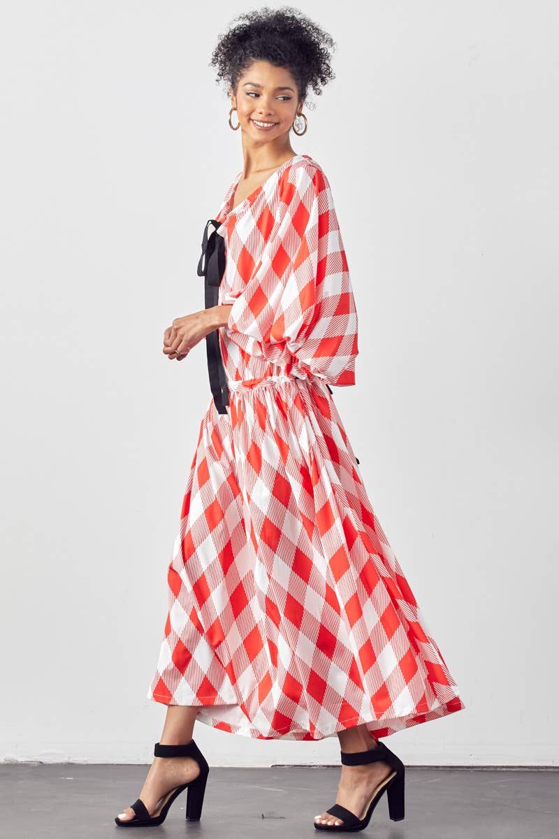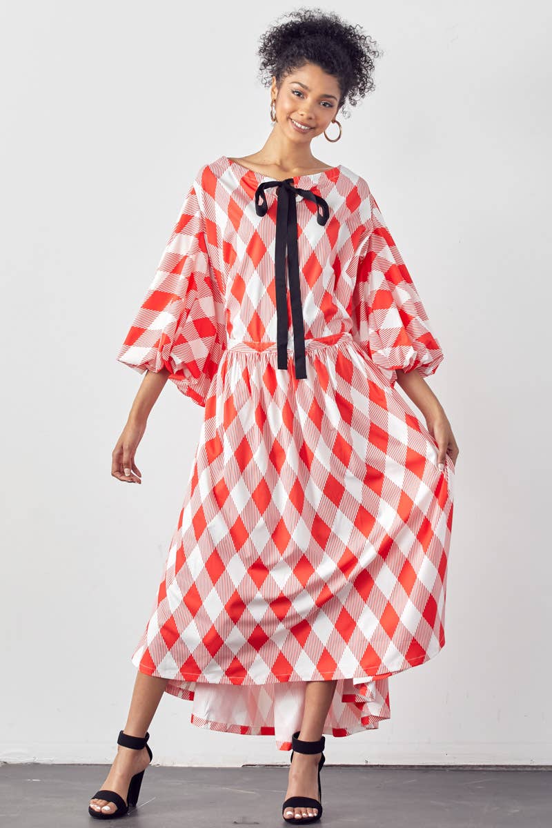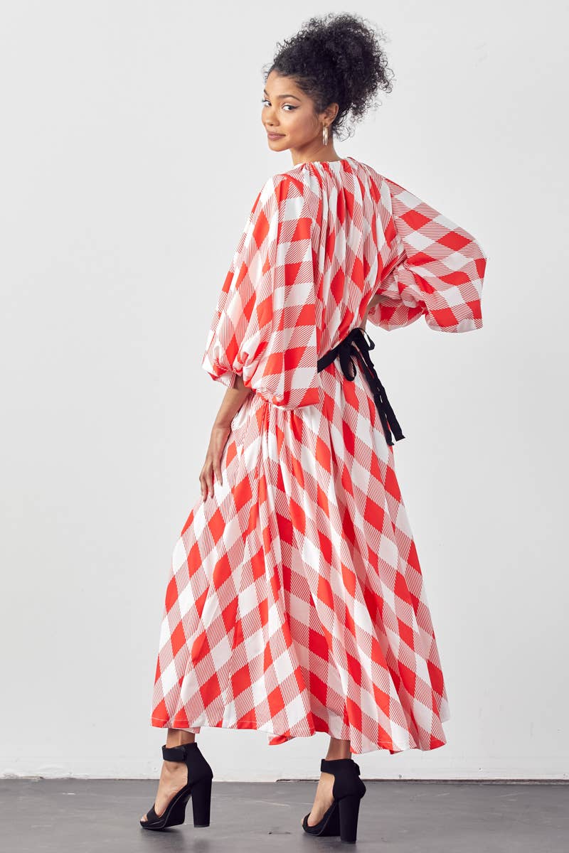 BALLOON SLEEVE DRESS WITH POCKETS -SELF TIE BOW -OVERFITTING STYLE -ADJUSTABLE WAIST -EXTRA WIDE A-LINE -POCKETS -MAXI LENGTH -SIZE DOWN, RUNS VERY GENEROUS! The model is 5'9 and is wearing a size Small