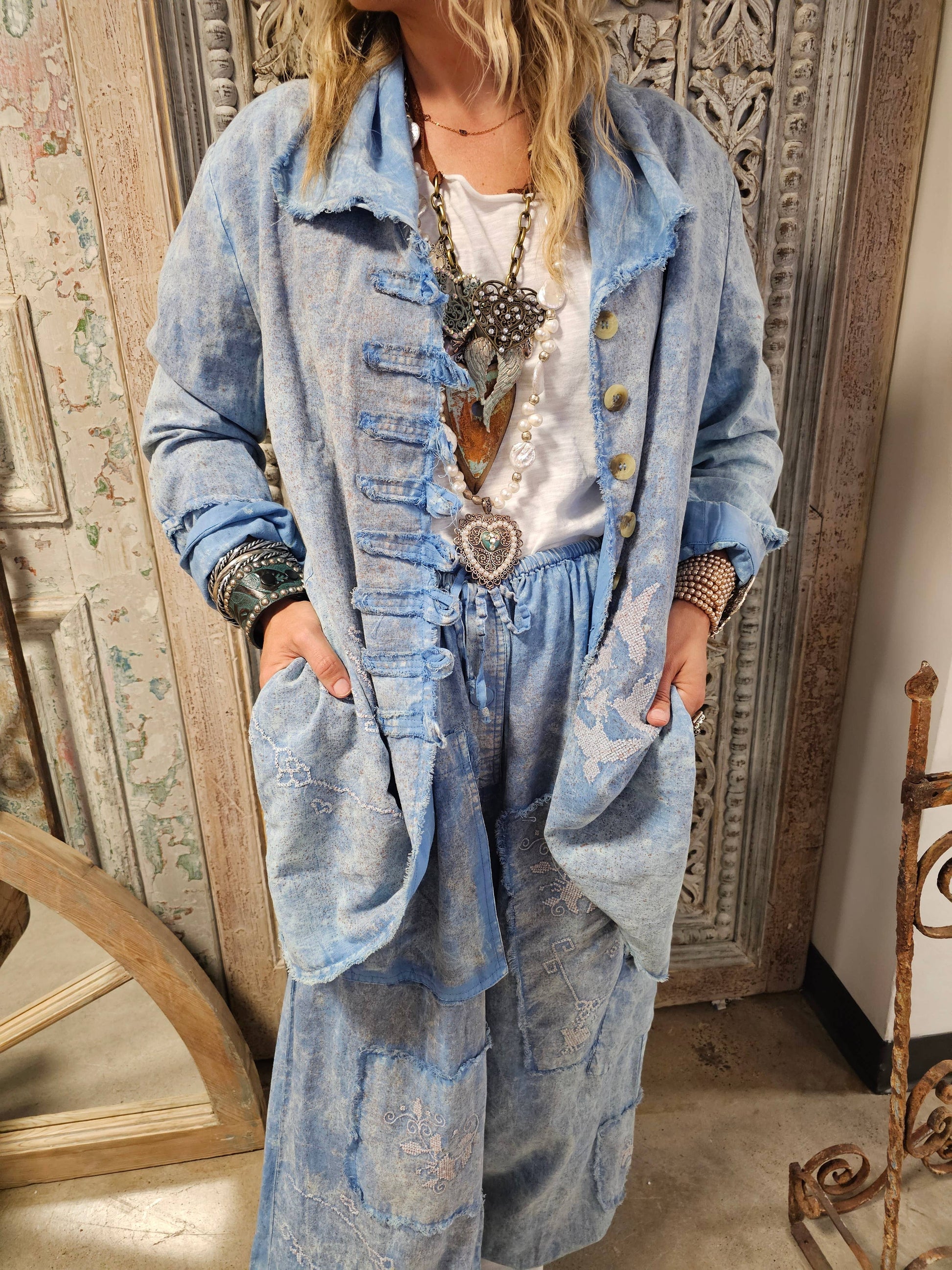 Washed and distressed, these amazing one size genie pants are covered in gorgeous cross stitch. Pockets and adjustable waistband makes these so comfortable to wear. These are One Sized.