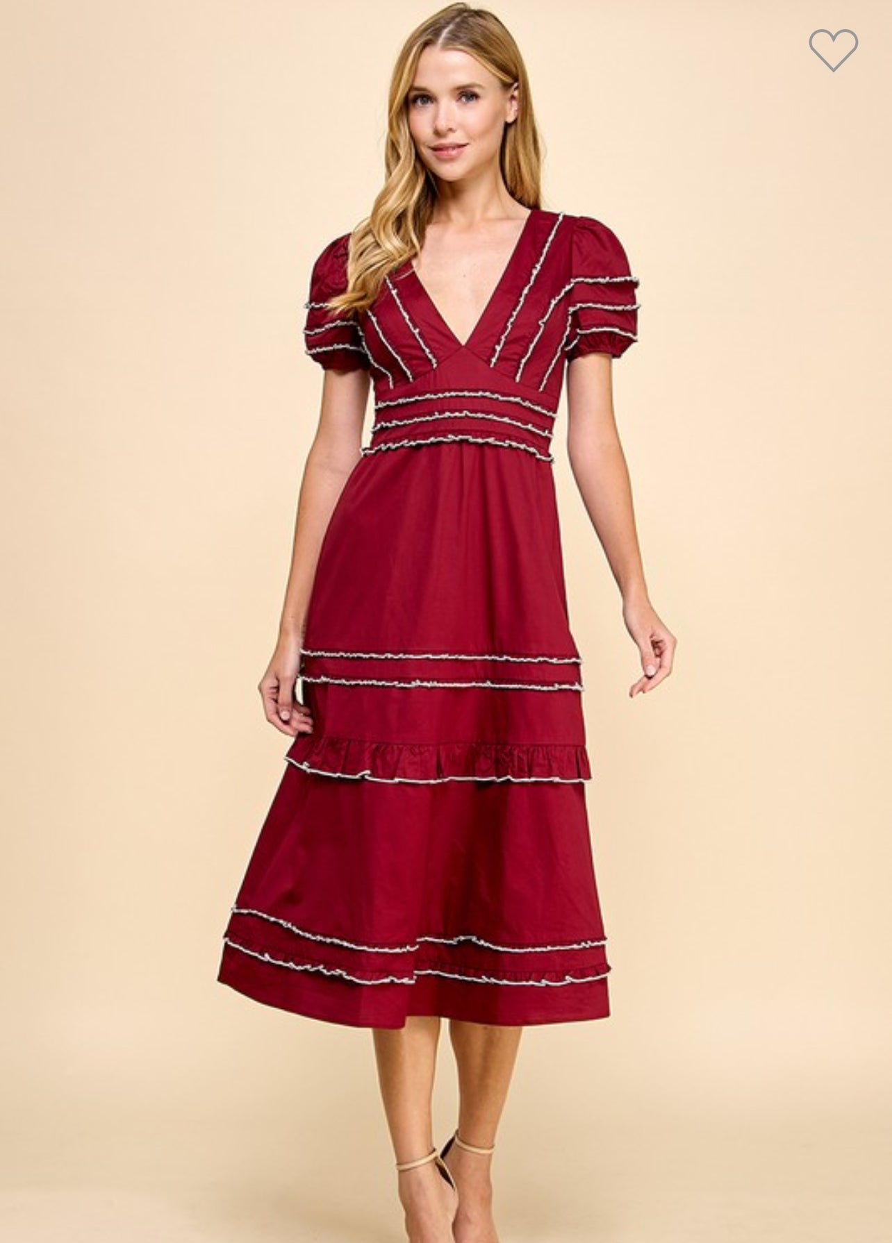 Discover the perfect blend of sophistication and charm with our Burgundy Bliss Midi Dress. Featuring a v neck and delicate white scallop trim, this midi dress exudes elegance. The puff sleeves add a touch of femininity, making it a must-have for any fashion-forward woman.