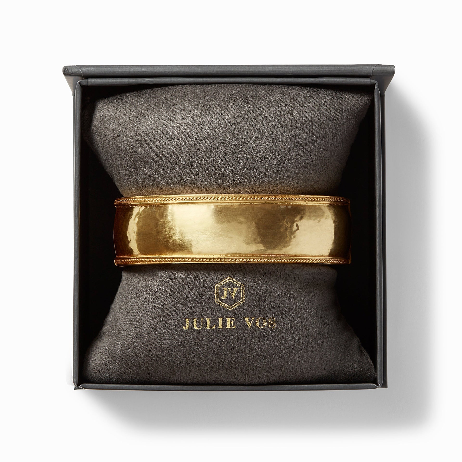Luxuriously gilded wide bangle with fine twisted wire detail.