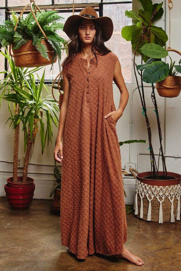 Jump into style with our textured and oversized camel jumpsuit! This sleeveless piece is perfect for making a statement and staying comfortable. So go ahead, check yourself into style with this trendy jumpsuit!