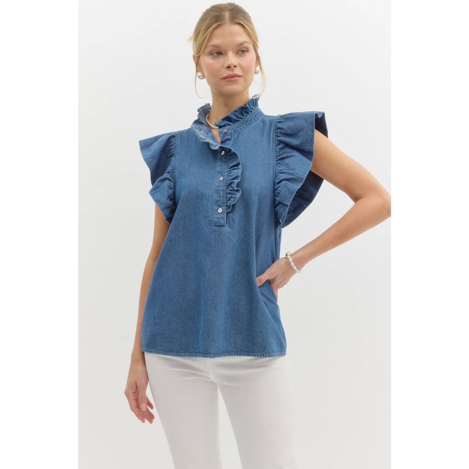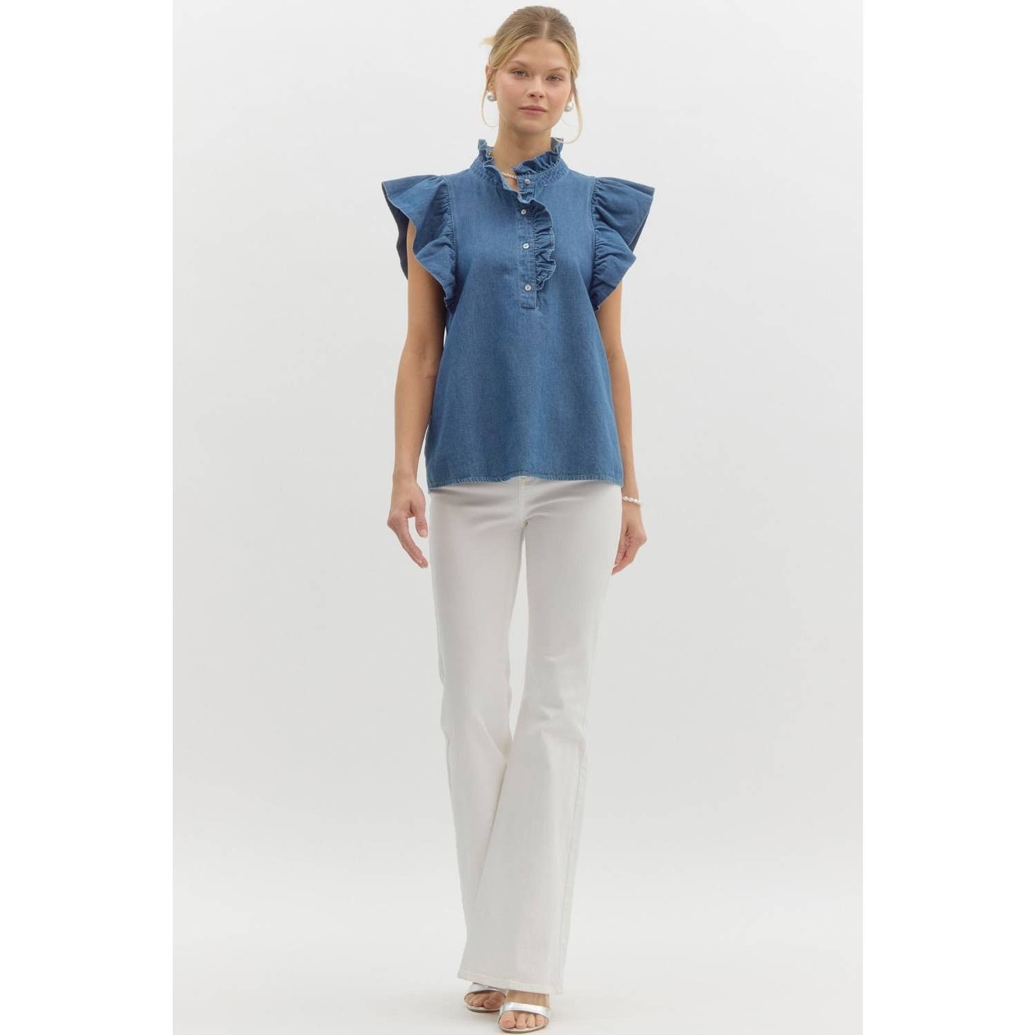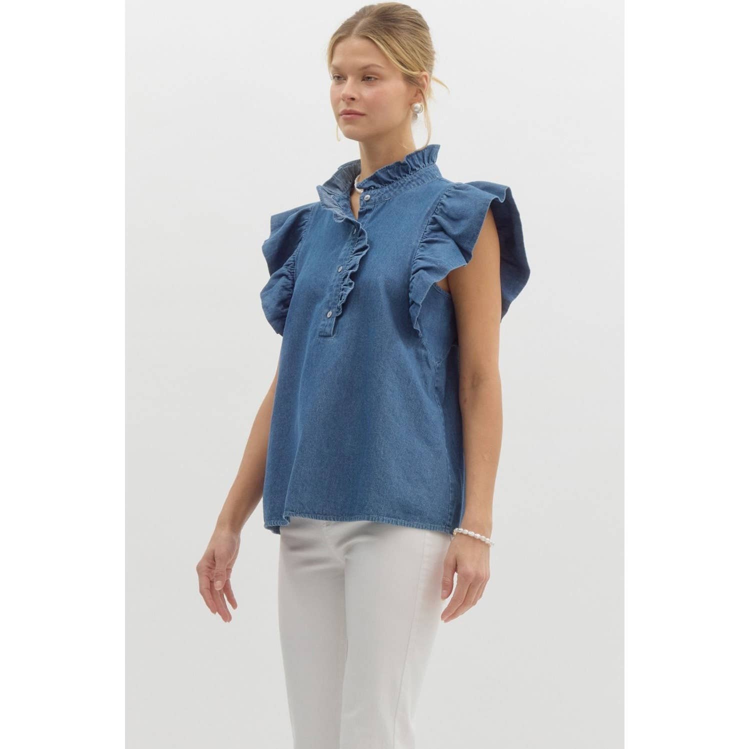 Unleash your inner fashionista in the Days of Denim Top! This playful top features a ruffle flutter design and a stylish front button closure with an added touch of ruffles. Lightweight and non-sheer, this top will be a comfortable and stylish addition to your wardrobe.