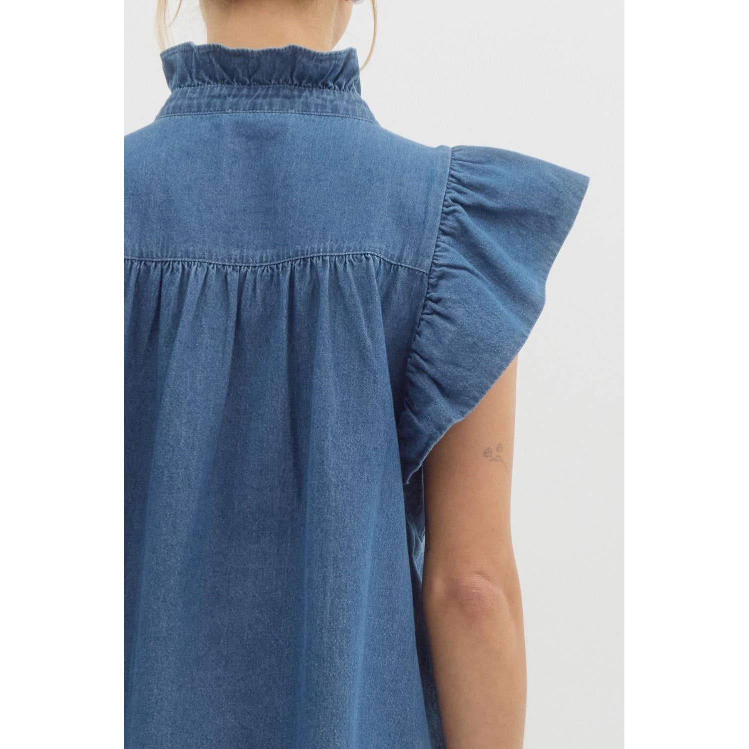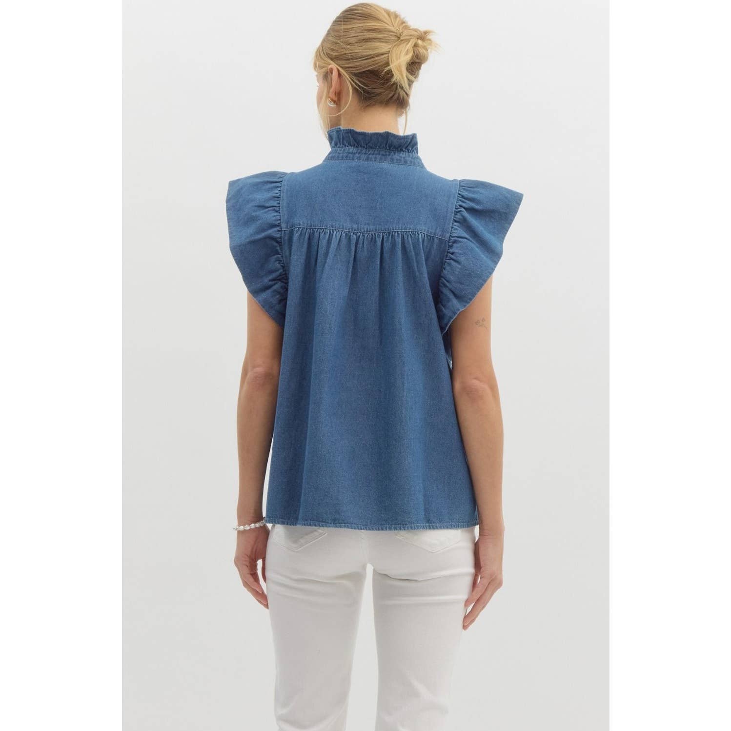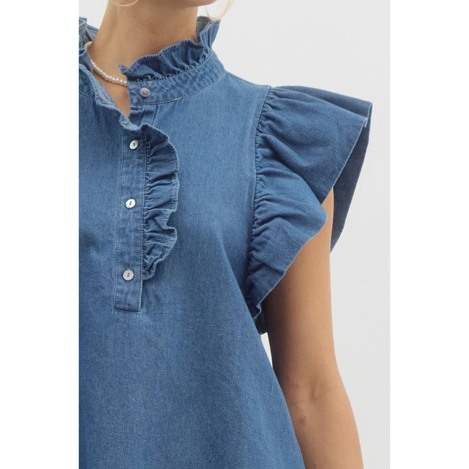 Unleash your inner fashionista in the Days of Denim Top! This playful top features a ruffle flutter design and a stylish front button closure with an added touch of ruffles. Lightweight and non-sheer, this top will be a comfortable and stylish addition to your wardrobe.