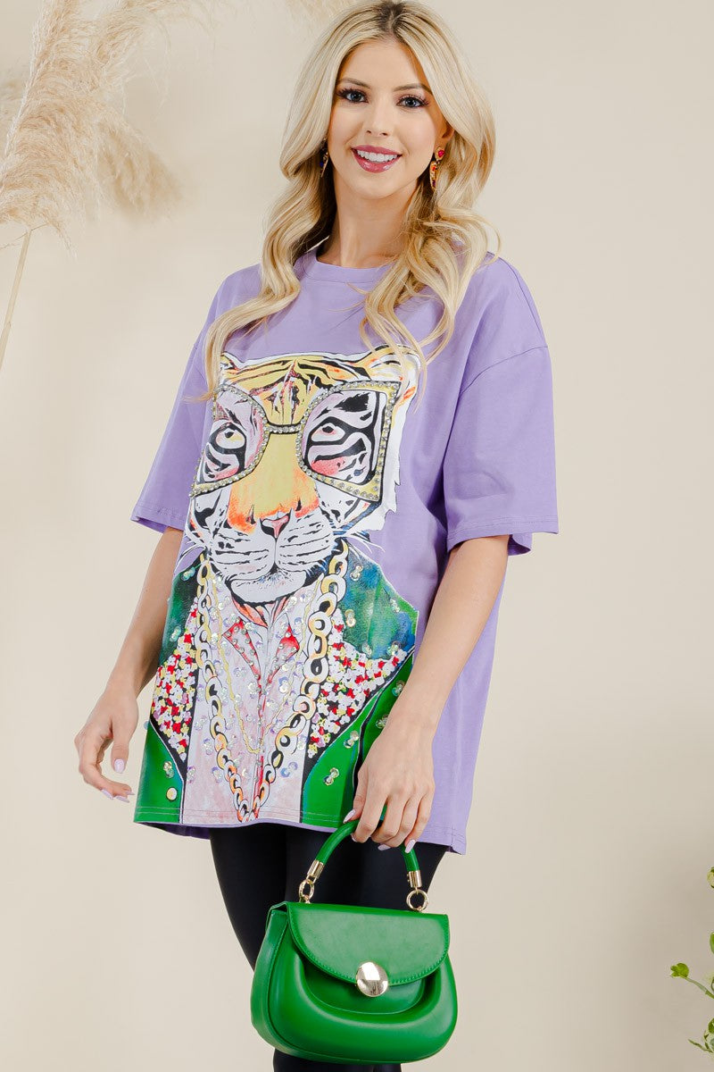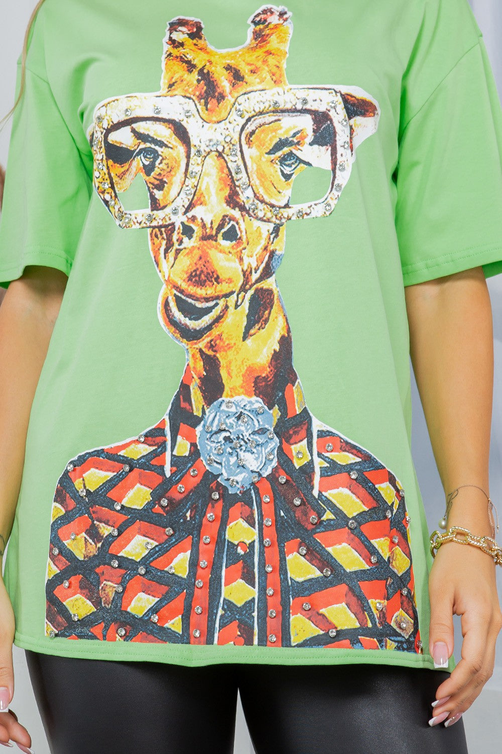 Unleash your inner fashionista with our Designer Inspired Embellished Top! This oversized fashion T-shirt features a trendy print adorned with sequins and stones for a touch of glamour. Elevate your style and stand out from the crowd with this unique and chic top.