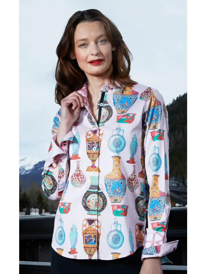 Introduce a playful touch of color to your wardrobe with the Dizzy Lizzie Rome Shirt. Featuring intricate Chinese vases on a soft pink background, this shirt is perfect for making a statement. Don't take yourself too seriously? Then this is the perfect addition to your collection.