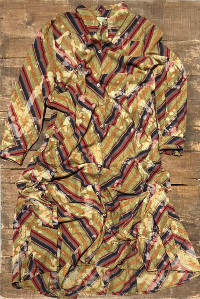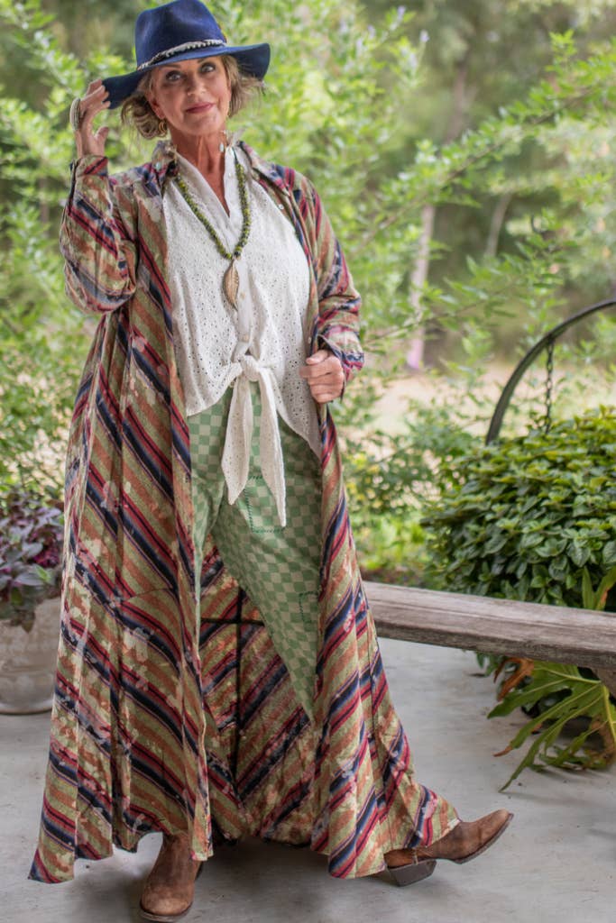 The Jaded Gypsy Fade Away Duster is a chic and versatile addition to any wardrobe. The unique bleached design adds a touch of edginess to the duster's long, flowy silhouette. Perfect for layering and transitioning between seasons.