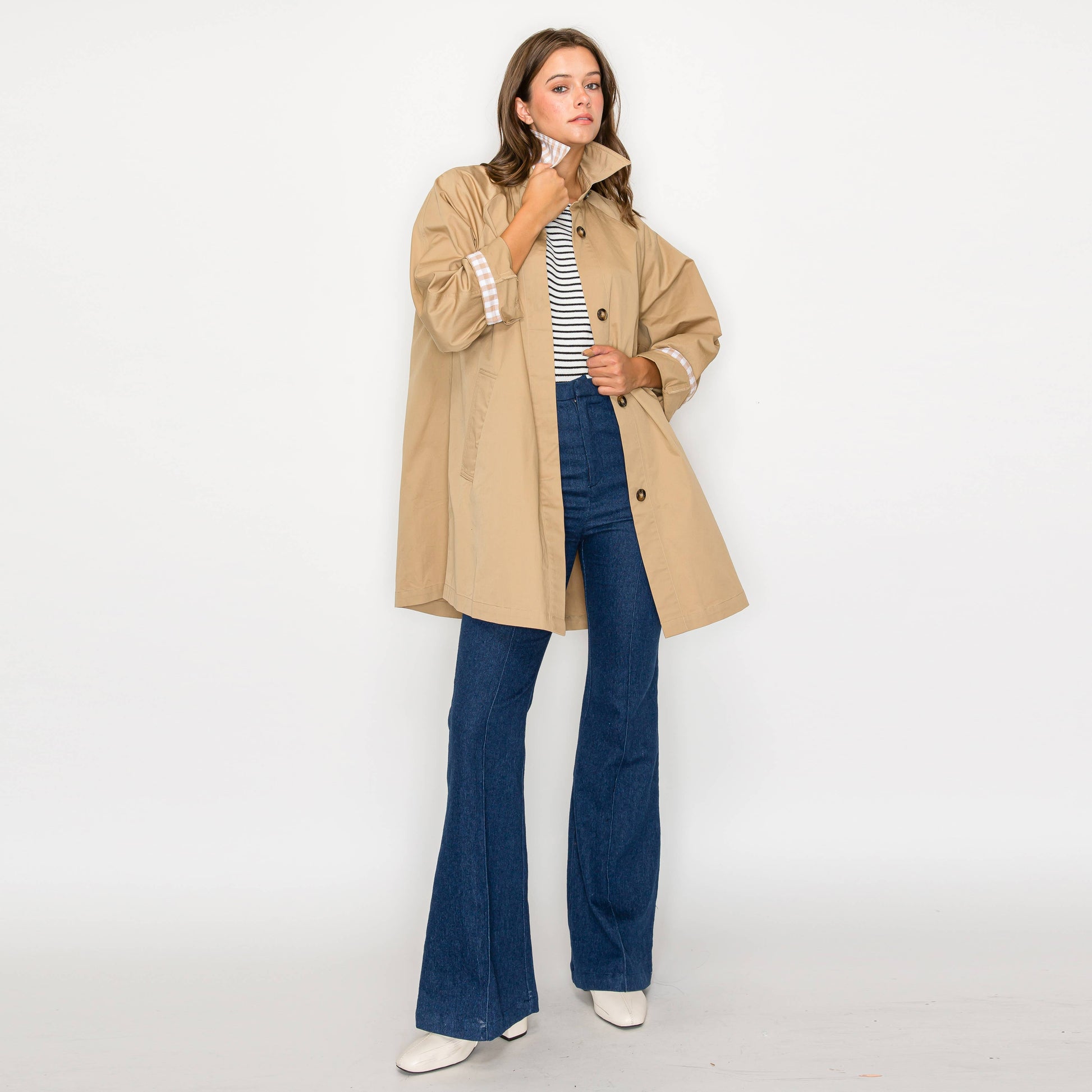 The Oversized French Trench Coat combines timeless design with modern comfort. Featuring a classic collar and a relaxed oversized fit, it effortlessly elevates your wardrobe. The center front hidden buttons keep the look clean and polished, while the subtle gingham check lining on the collar and cuffs adds a refined, stylish detail. Made with a breathable 100% cotton lining and a durable 100% polyester shell, this coat offers both comfort and resilience for everyday wear. Perfect for adding sophistication to any outfit with ease.
