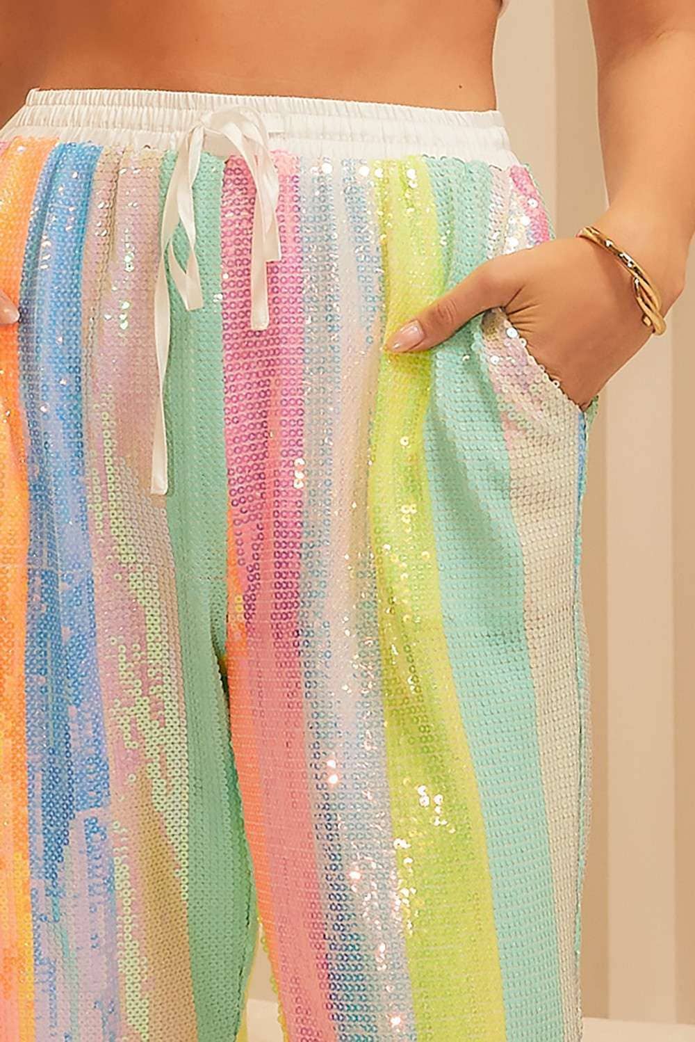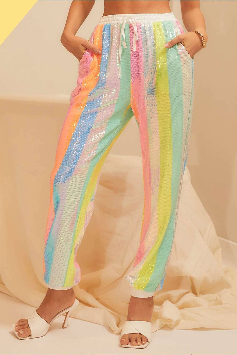 Get ready to shine with our Rainbow City Sequin Set! This stylish sequin set includes comfy joggers and an oversized pullover, perfect for a fun and playful look. Stand out from the crowd and add some sparkle to your wardrobe with this set. (Get ready to turn heads and feel confident in this unique set!)