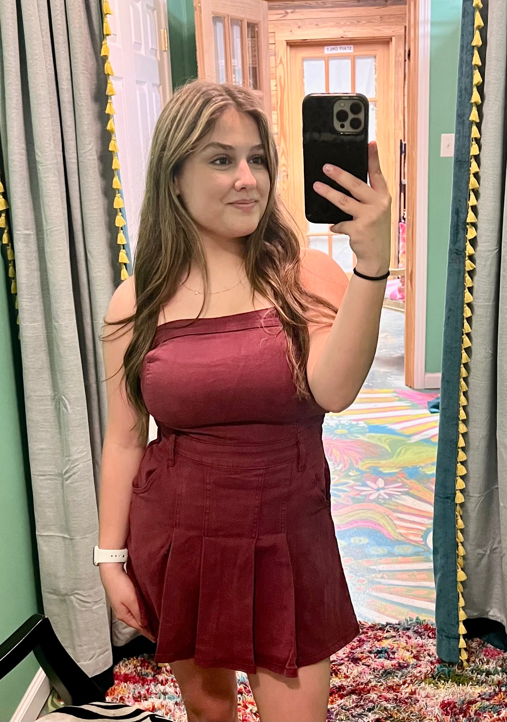 Be the ultimate game day fashionista with our strapless denim mini dress! With built-in shorts and pleated details, this dress is perfect for cheering on your favorite team. Stay comfortable and stylish at any sporting event. Game on!