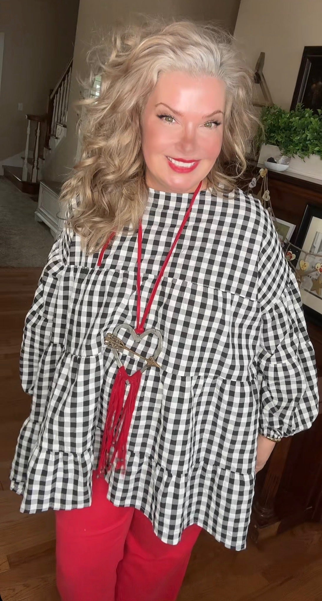 Elevate your casual look with this darling Gingham Babydoll Top. Its tiered design and puff sleeves add volume and movement, while the gingham print lends a playful touch. Perfect for any occasion, this top is a must-have for any stylish wardrobe! *VERY OVERSIZED*
