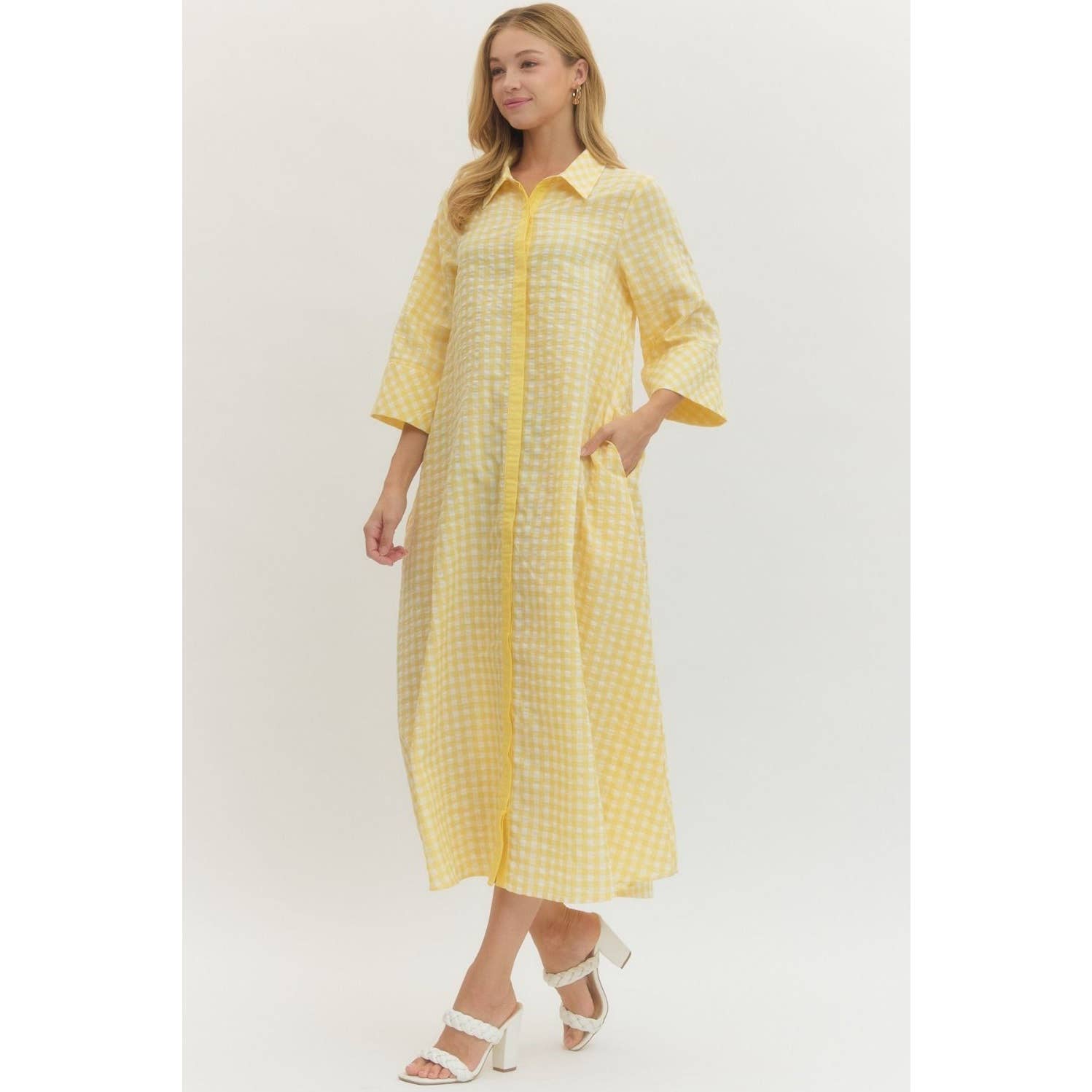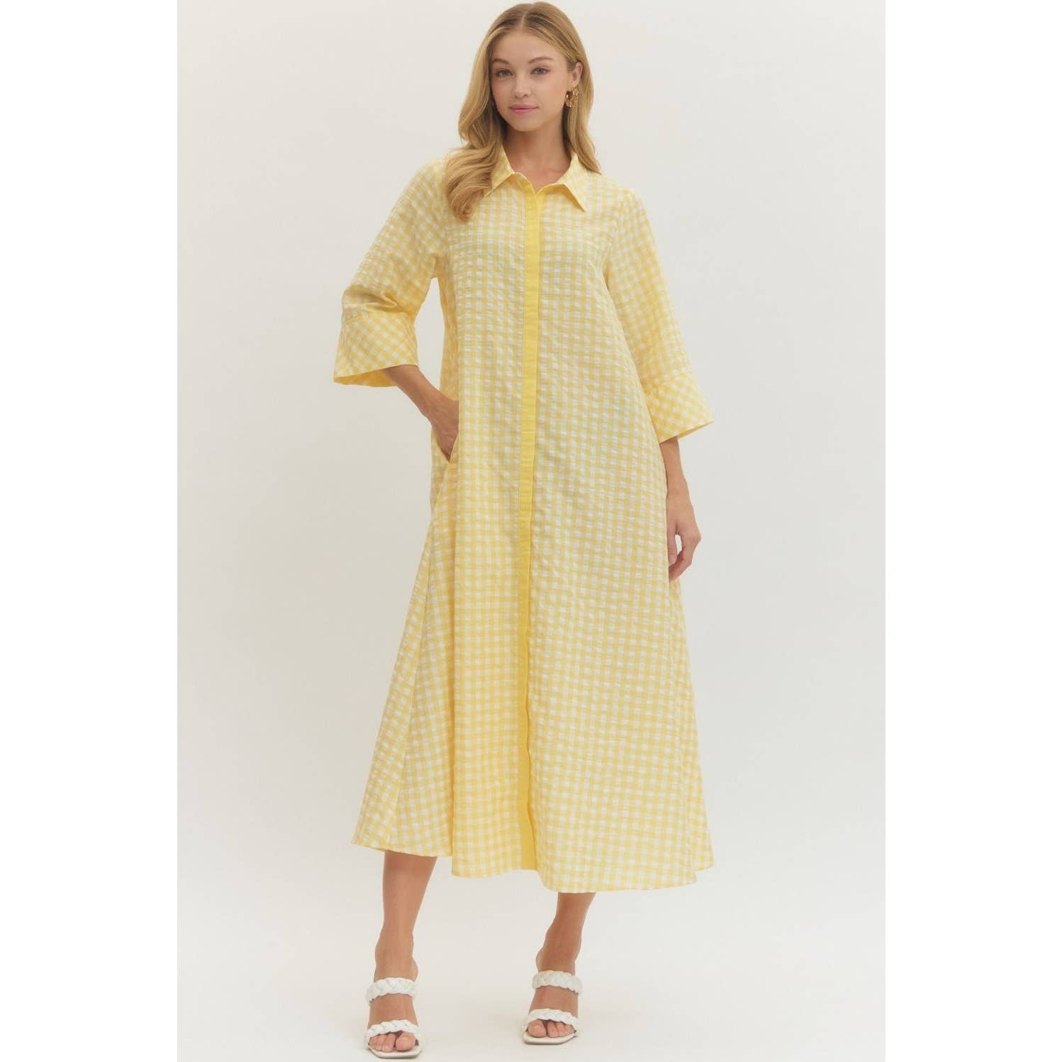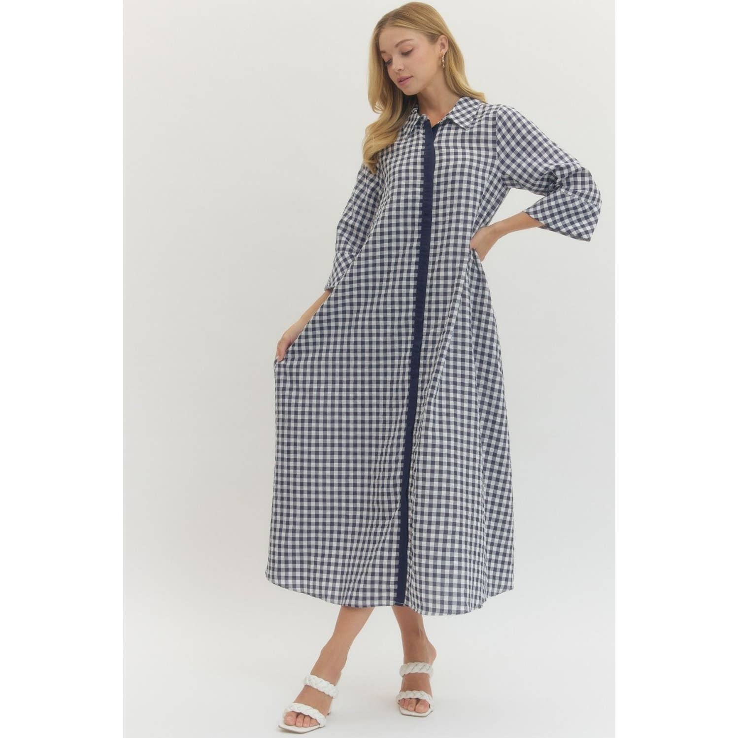 Fall for effortless style with this charming gingham midi dress. Featuring a classic shirt collar, hidden button front closure, and practical side pockets, it's designed for all-day comfort. The lightweight woven fabric in a cotton-polyester blend drapes beautifully without clinging, while the unlined construction keeps things breathable. Perfect for casual outings or dressed-up occasions, this 3/4 sleeve midi delivers timeless appeal with modern convenience.