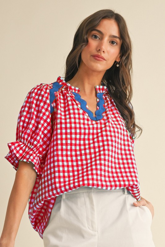Get ready to turn heads with our Gingham Ric-Rac Top! The classic gingham check pattern is elevated with contrasting ric-rac trim and adorable puff sleeves. The ruffle detail adds a touch of femininity to this statement piece. Experience the perfect blend of style and comfort!