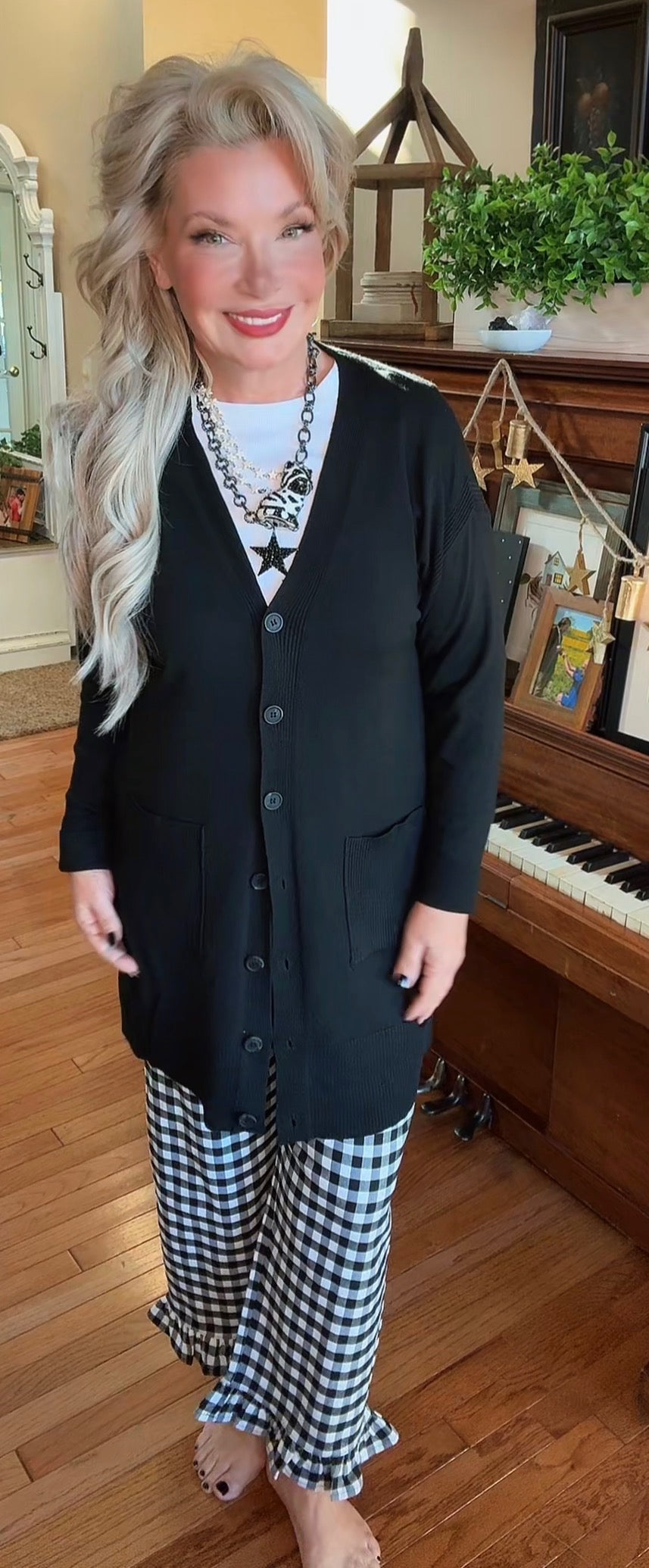 Gingham Ruffle Trim Straight Leg Pants - These gingham pants feature a cropped straight leg silhouette with front patch pockets, a hidden back zipper closure, and playful ruffle trim along the hem for a charming, vintage inspired finish. - Model is 5'9" and wearing a small. - 65% RAYON, 30% NYLON, 5% SPANDEX