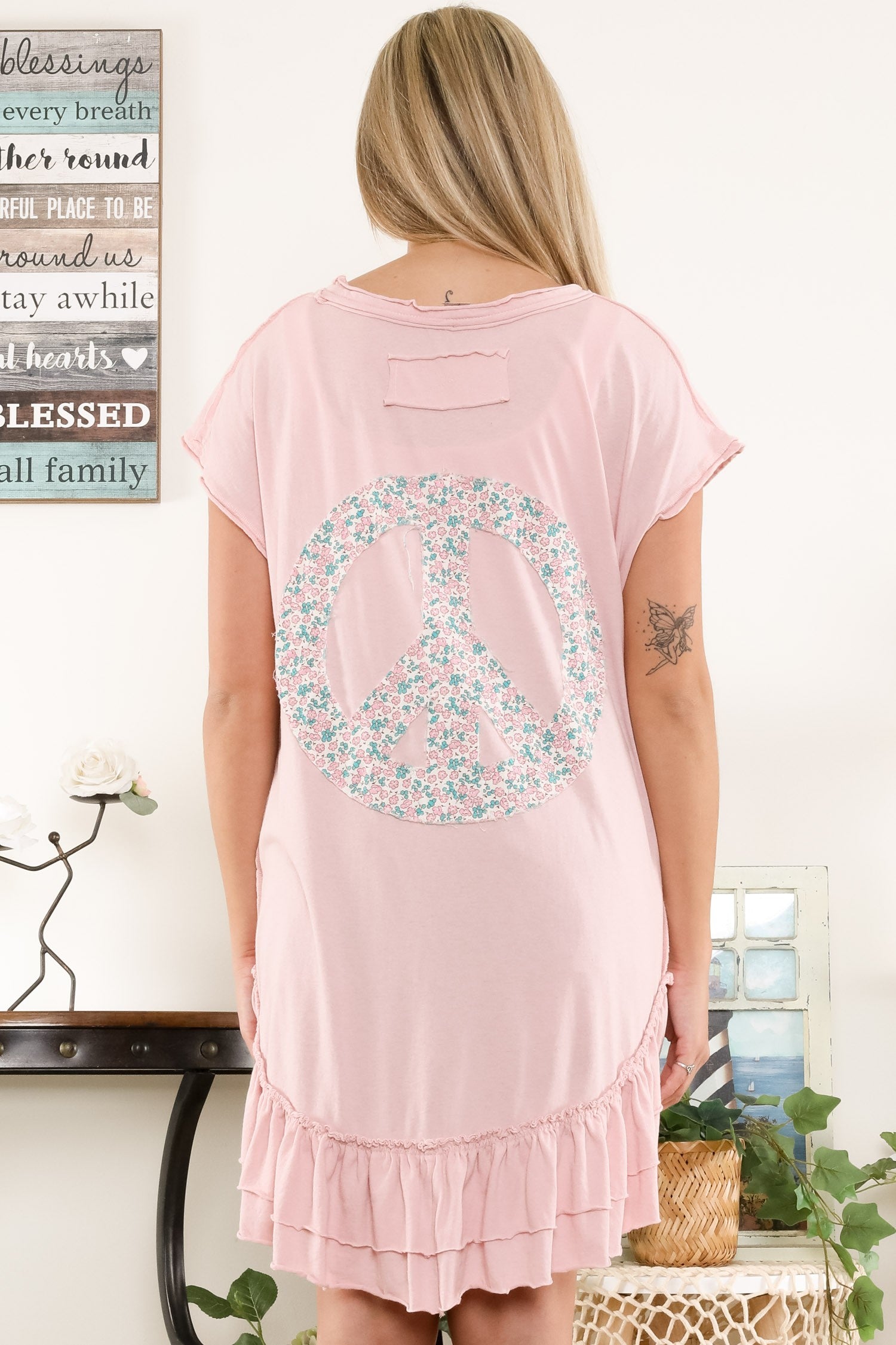 Get ready to channel your inner hippie with our Hippie Chick Peace Sign Dress. This dress features a beautiful floral peace sign on the back, along with a round neck and a ruffled bottom for a fun and playful look. Spread love and positive vibes wherever you go with this dress!