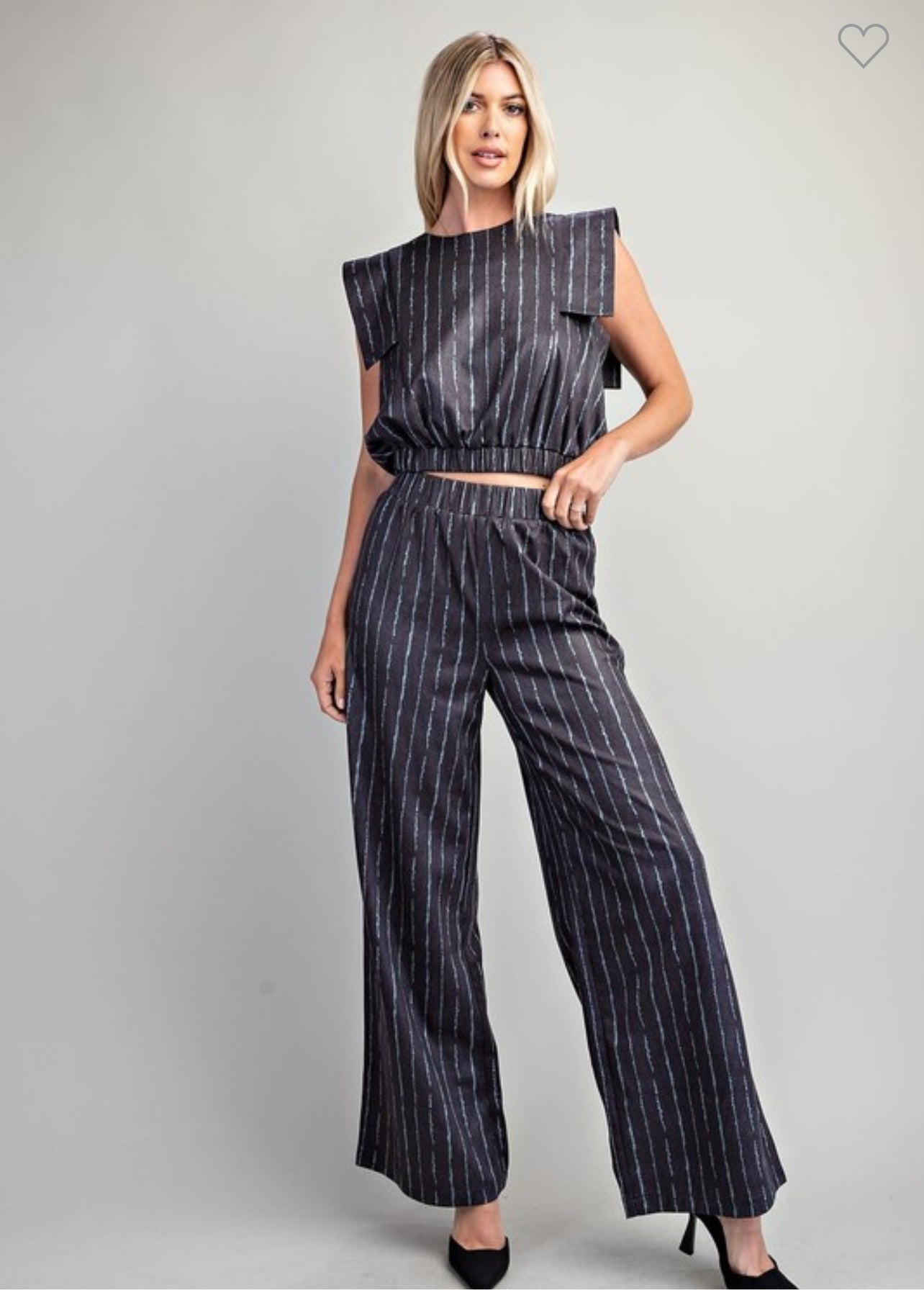 Effortlessly exude confidence and professionalism in our I Mean Business Cropped Set. Featuring a navy and light blue vertical stripe pattern, this set includes a cropped top with shoulder pads and an elastic waist for a flattering fit. Perfect for women who mean business.