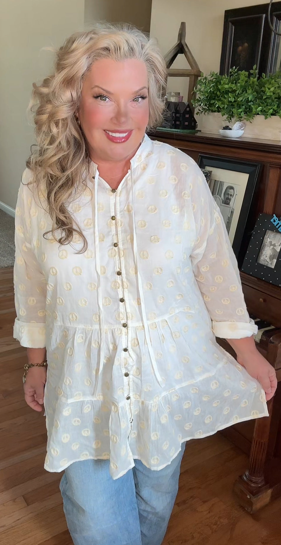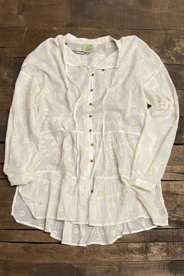 This Jaded Gypsy Peace Be With You Tunic features embroidered peace signs and a button up design. Perfect for those looking to add a touch of peace and positivity to their wardrobe. Stay stylish and spread good vibes with this tunic.