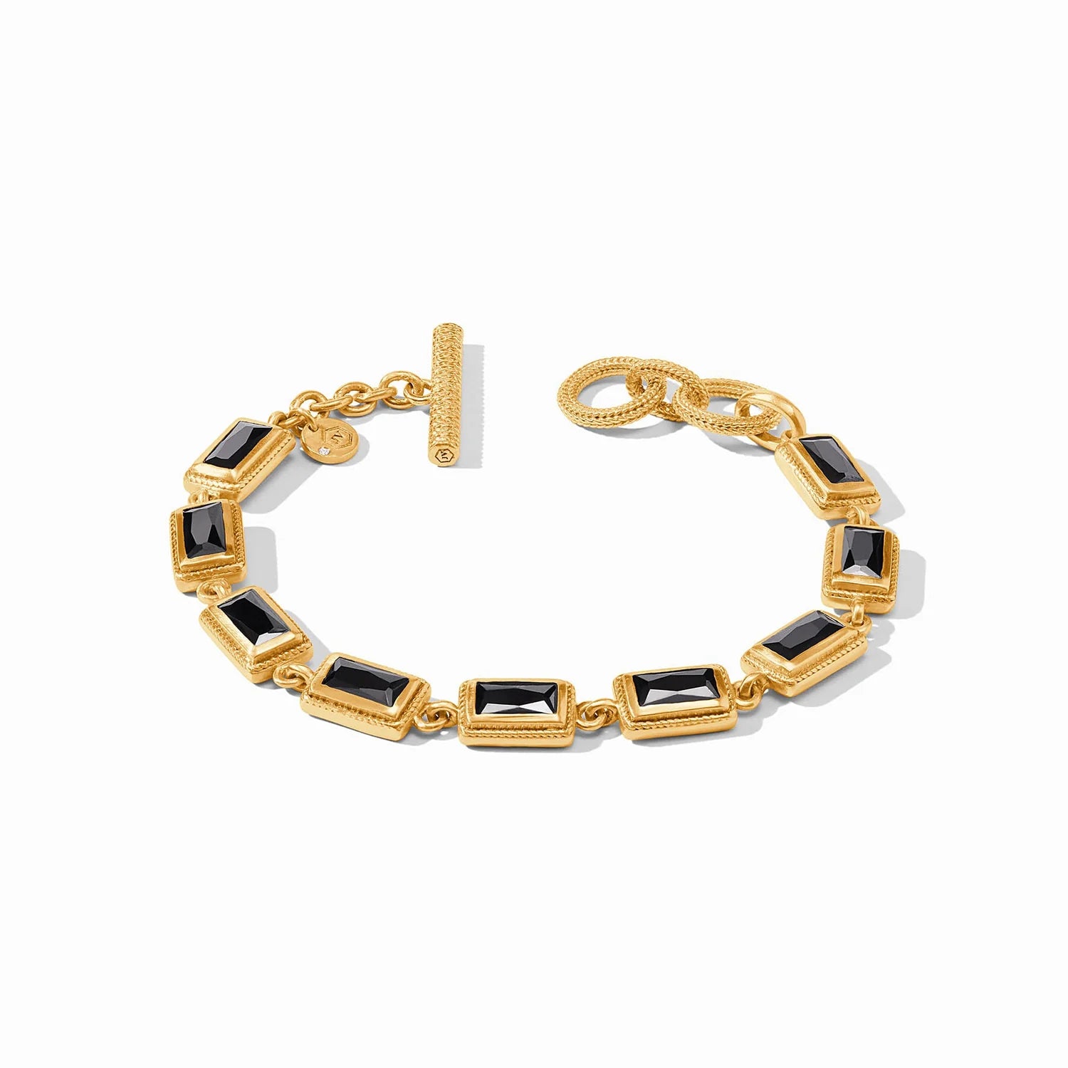 Baguette-cut gemstones embellished with twisted golden wire, closing with a matching toggle ring.