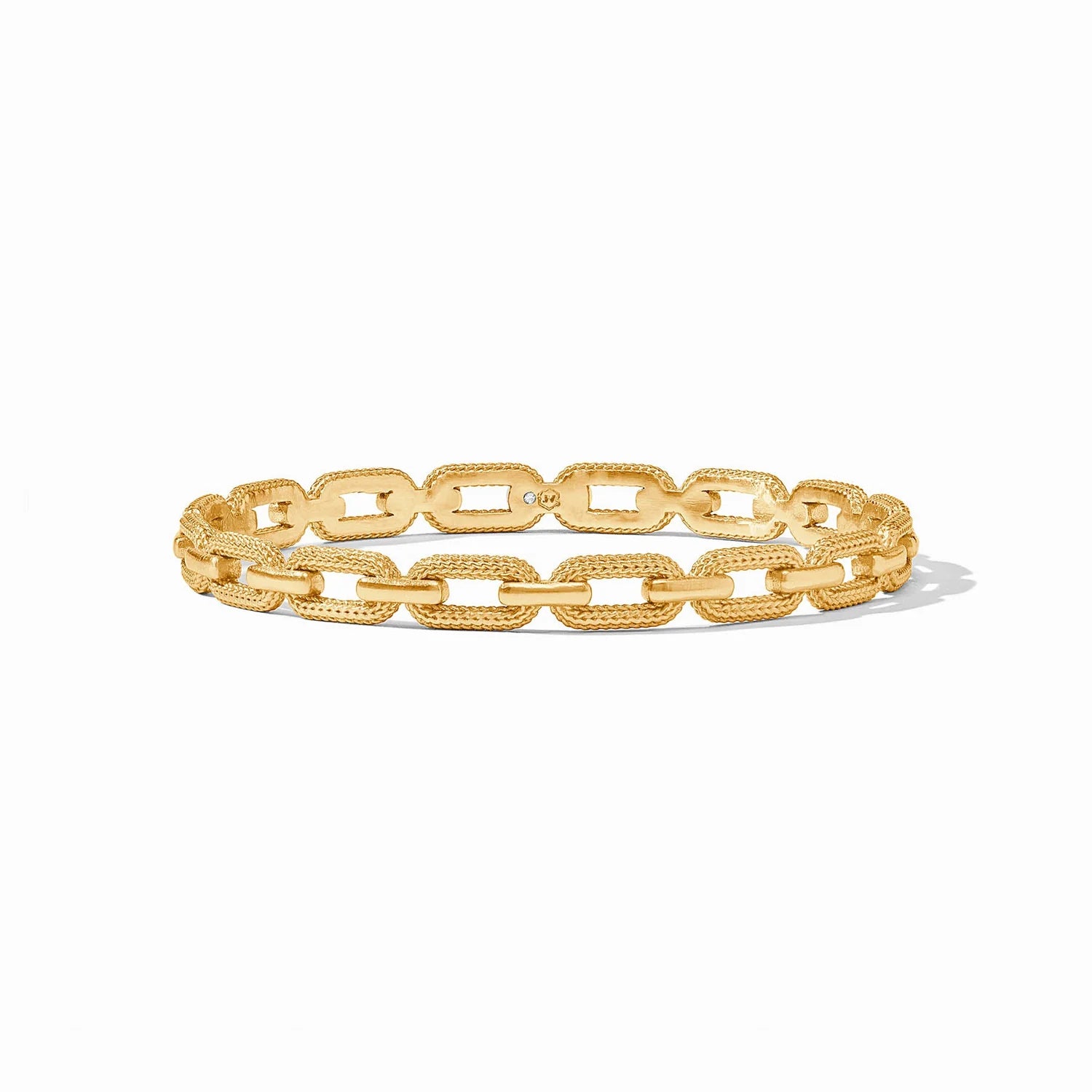 Elongated oval links textured with braided golden wire, fused with smooth connecting links.