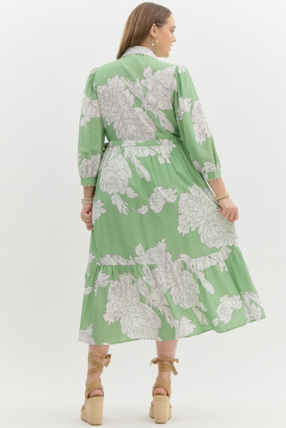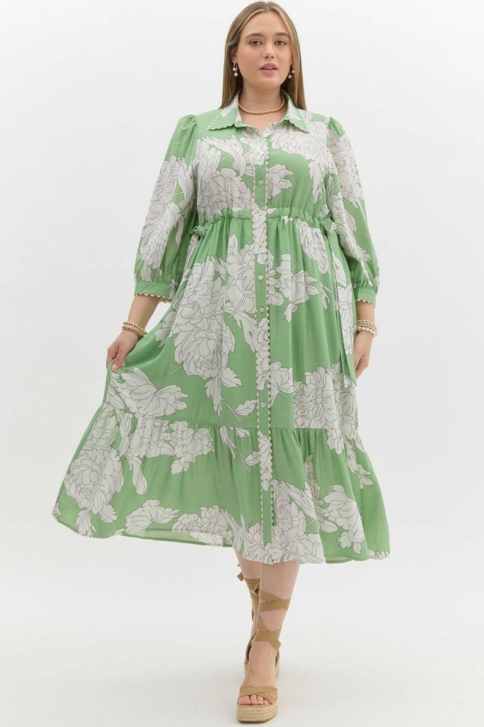 This floral print midi dress is definitely "mint to be"! With a collared button up style and scalloped trim detail, it's a playful and lightweight choice for any occasion. The elasticized waist with self tie detail adds a touch of whimsy, making this dress the perfect addition to your wardrobe.