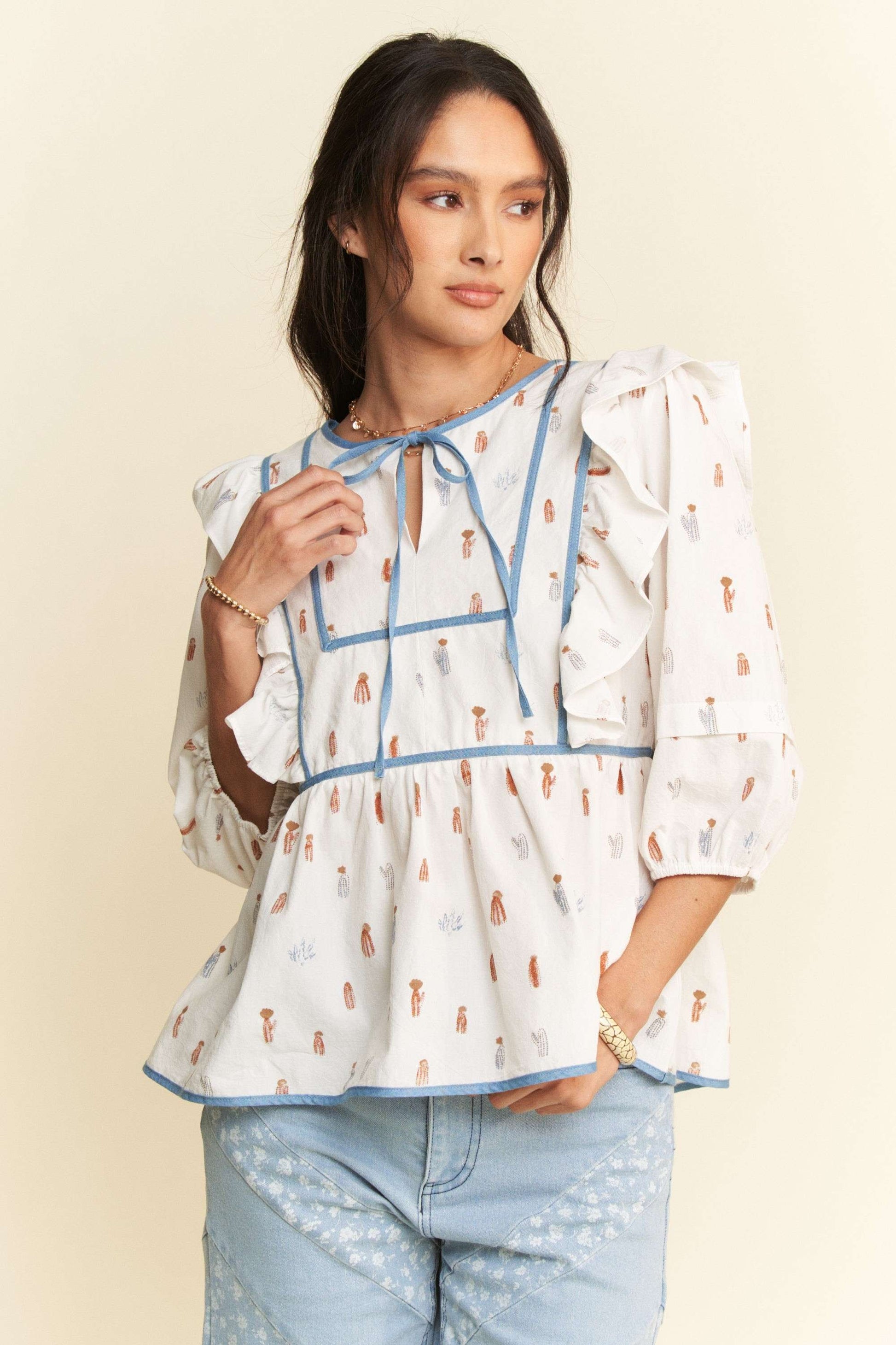 Add a touch of whimsy to your wardrobe with the Paint me Cactus Top! This adorable baby doll top features a binding bodice and 3/4 sleeves for a comfortable and flattering fit. Perfect for any occasion, this top is sure to make a fun statement anywhere you go.