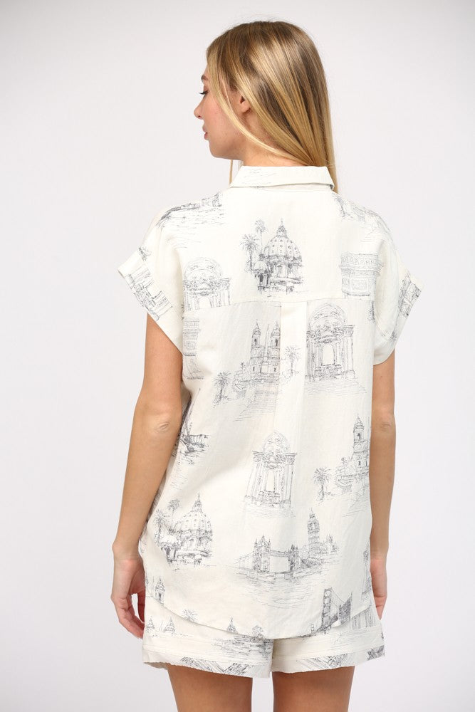 Experience the beauty of Parisian days in our linen short set. The scenic print, linen blend shirt features cap sleeves and the matching drawstring waist shorts provide ultimate comfort. Embrace the sophistication and elegance of French fashion with this exclusive set.