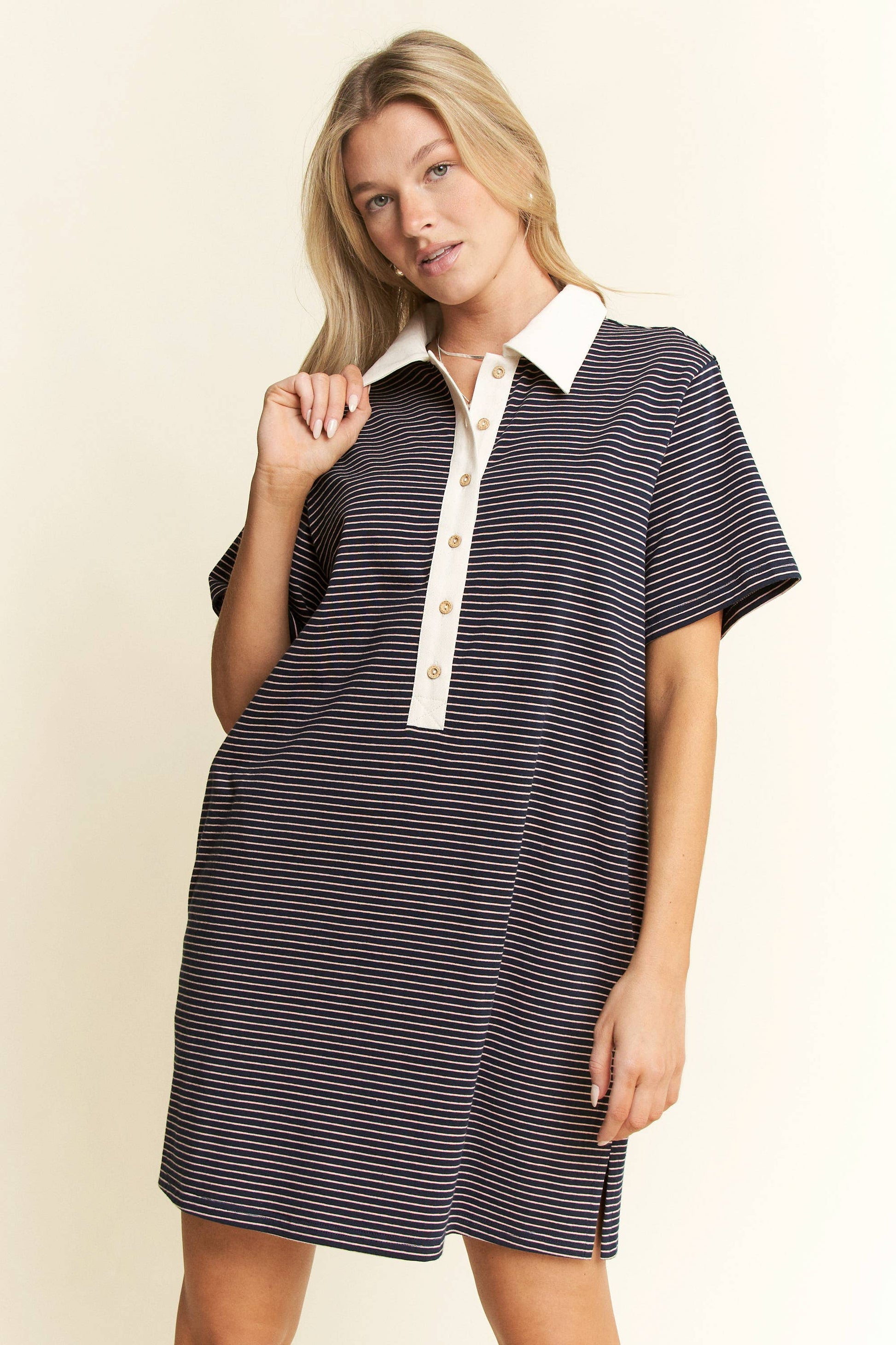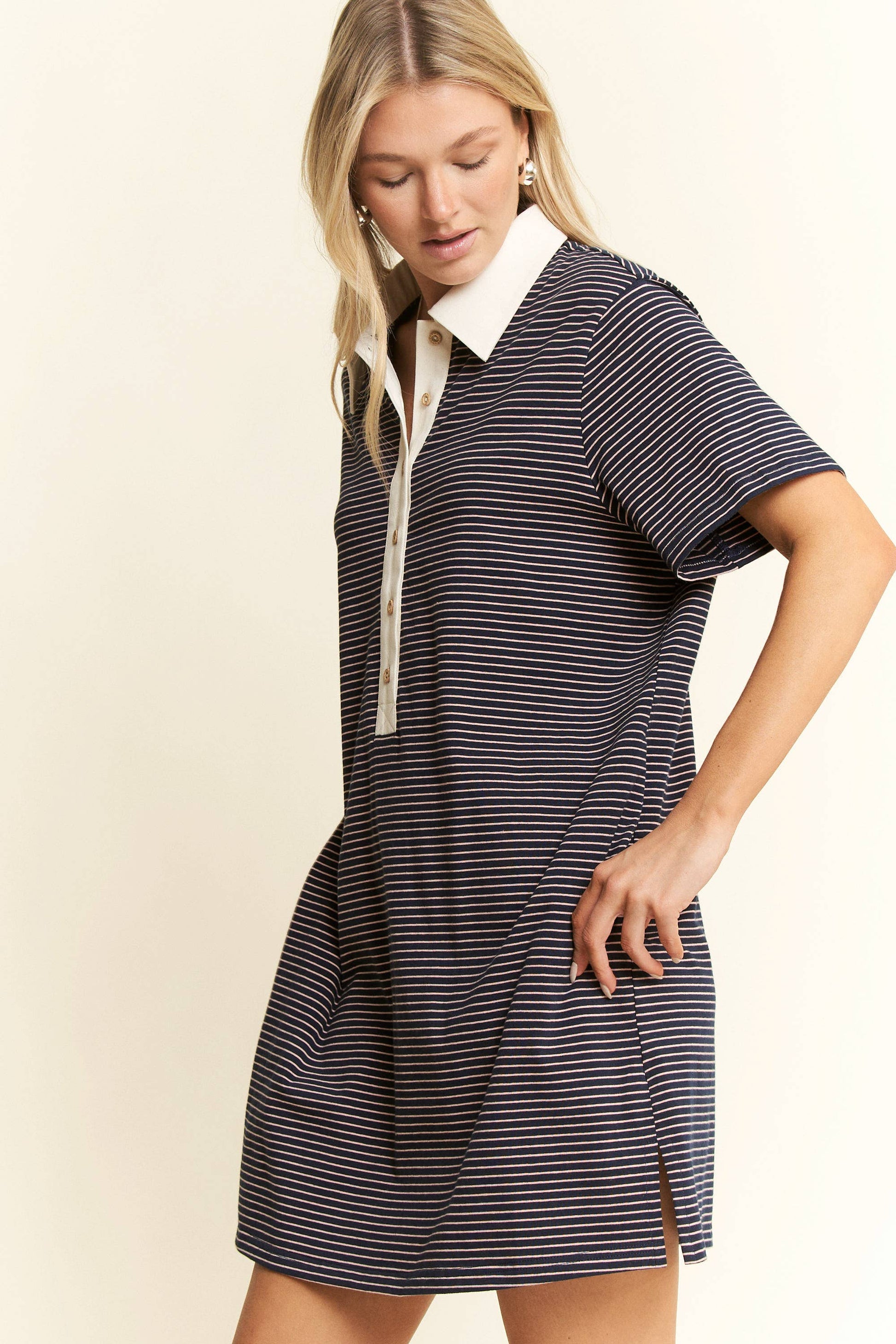 Get ready to rock the nautical look with our PIN STRIPE BUTTON DOWN DRESS! This navy dress features a stylish stripe pattern and a trendy collared design. The button-up front and side pockets add functionality, while the side slit adds a touch of sass. Made with a comfortable blend of cotton and spandex, you'll look and feel great in this dress!