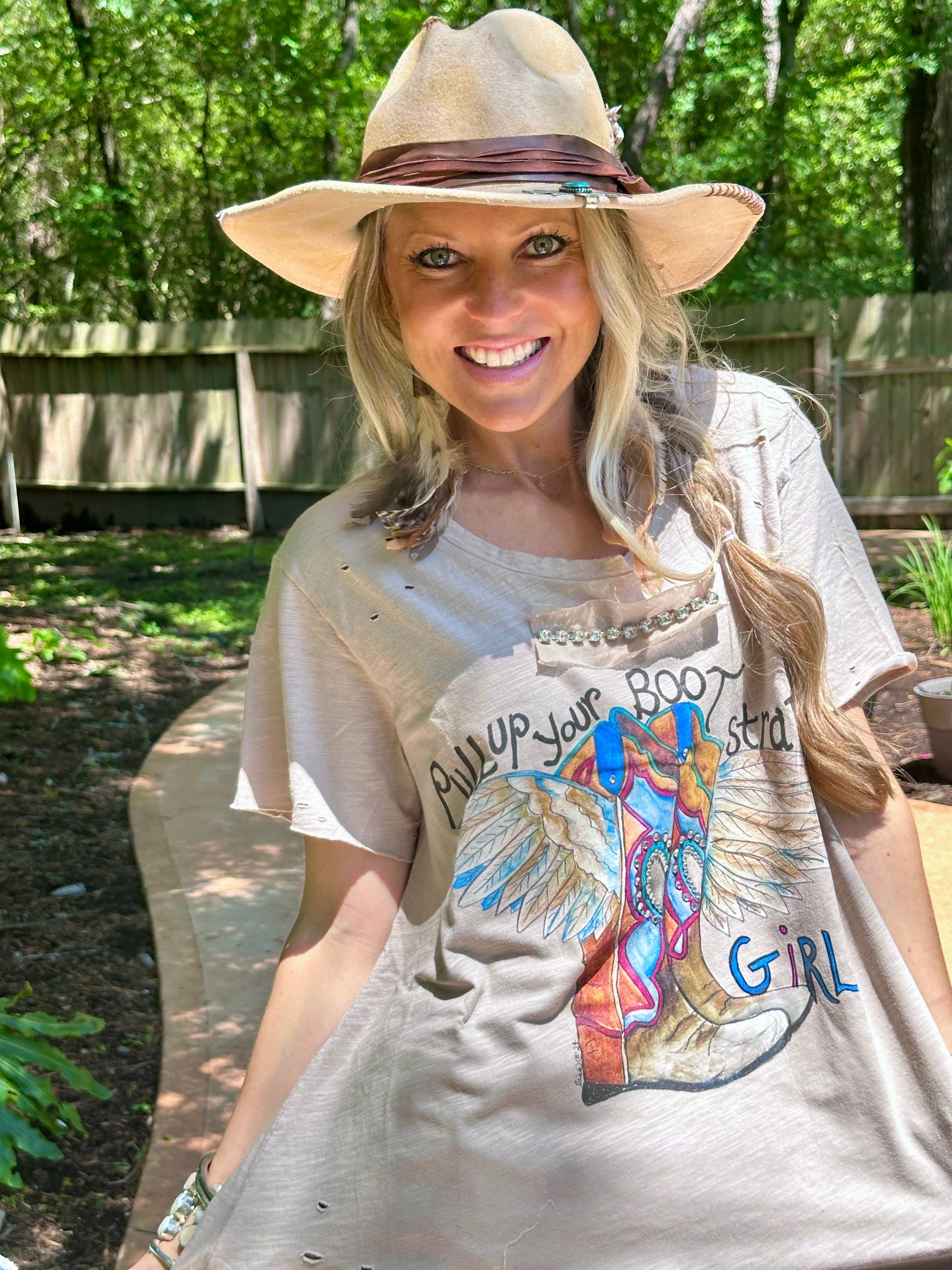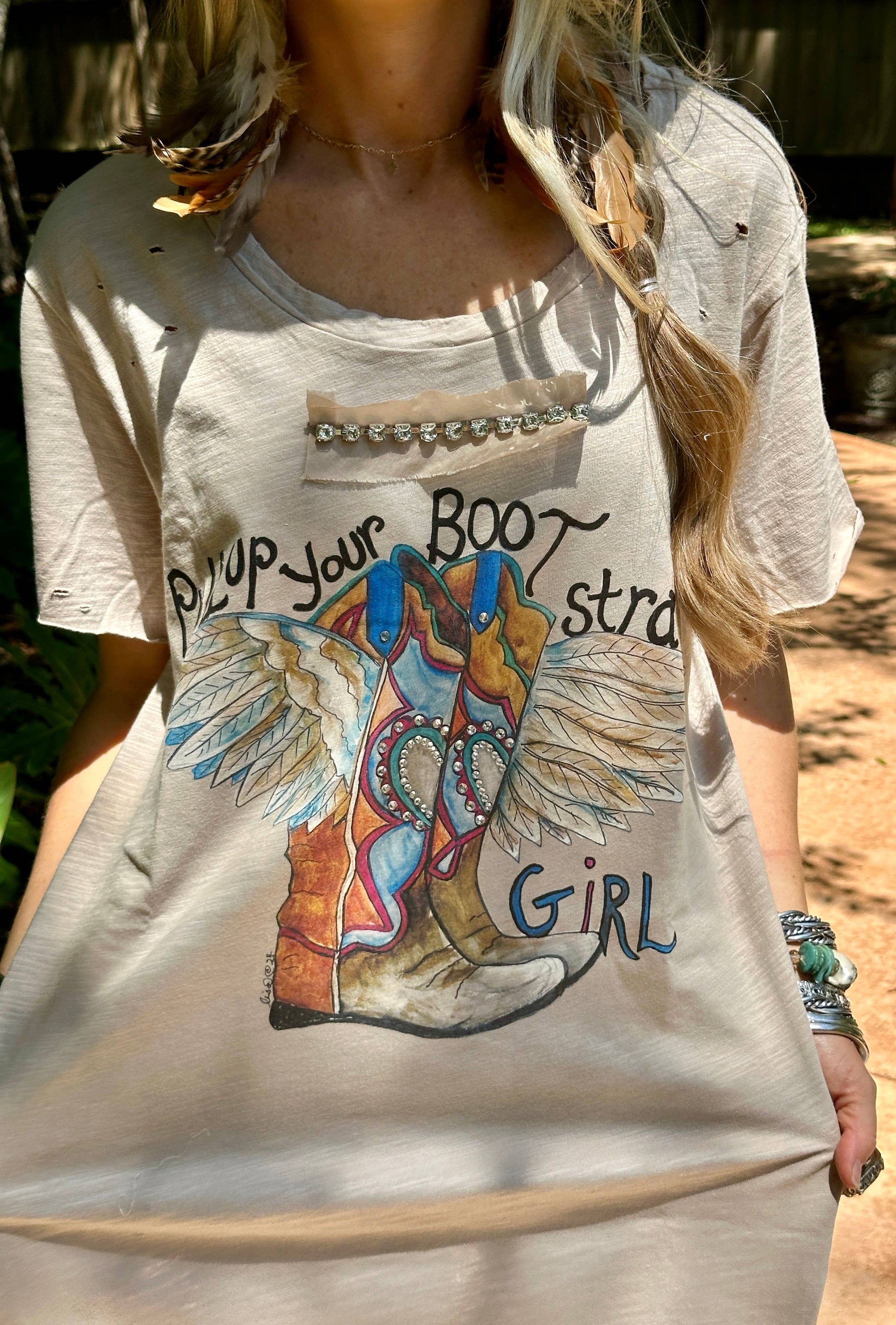 Pull up your boot straps Girl! Yessiree! Let's make this happen in our life. When life needs that little extra push...pull those boot straps up! Tattered and rhinestoned oversized shirt. sm lxl