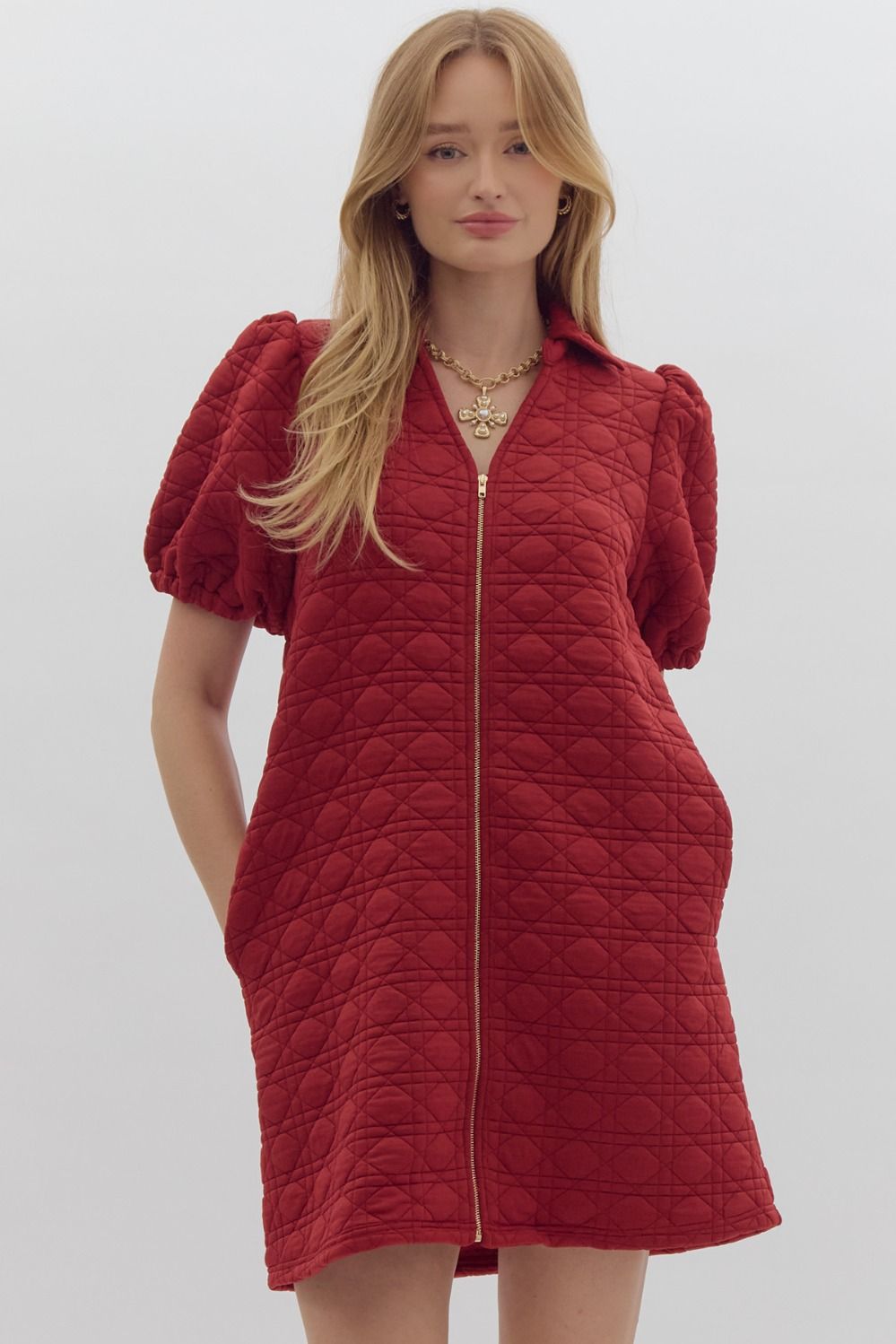 Upgrade your wardrobe with our Quilted for Time Zip-Up Dress. This mini dress features a cozy quilted design, convenient pockets, and an elasticized cuff for added comfort. The lightweight, non-sheer knit material makes it perfect for any occasion. Don't miss out on this must-have piece!