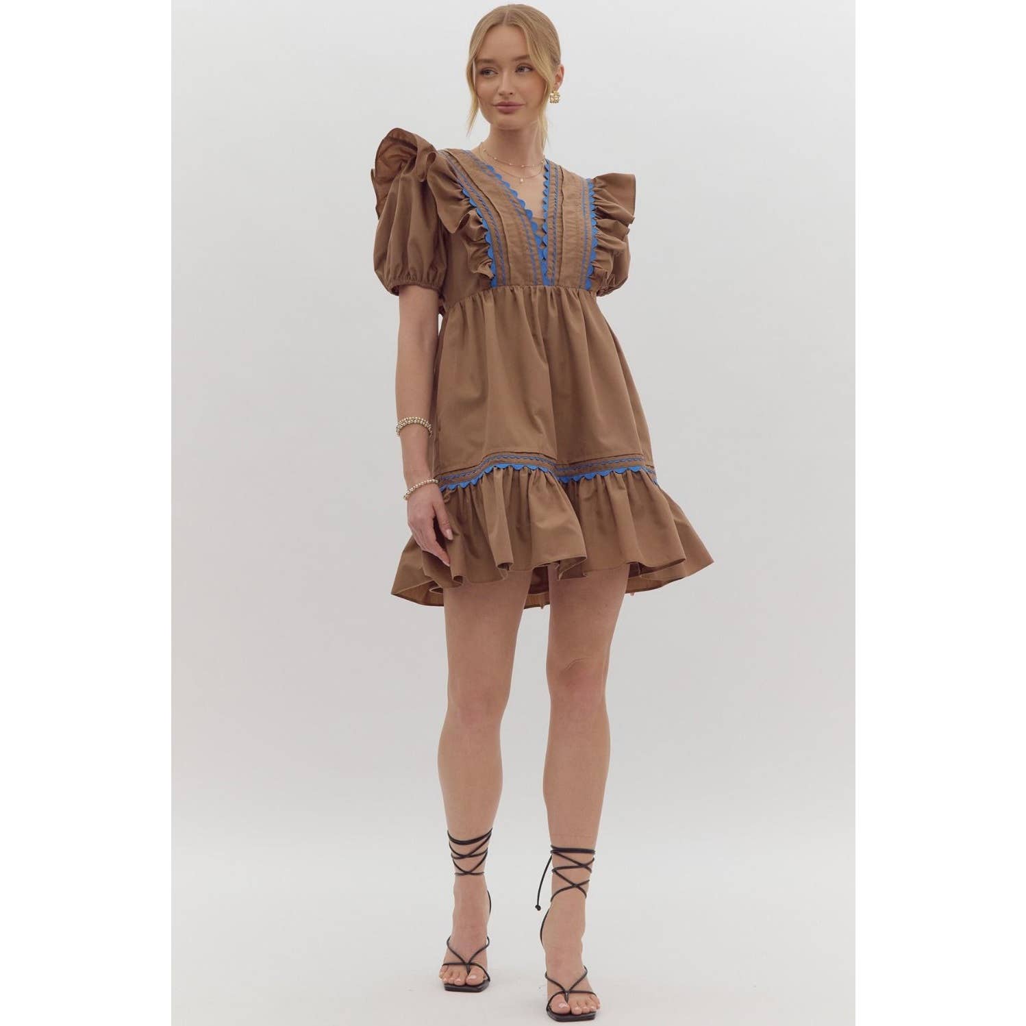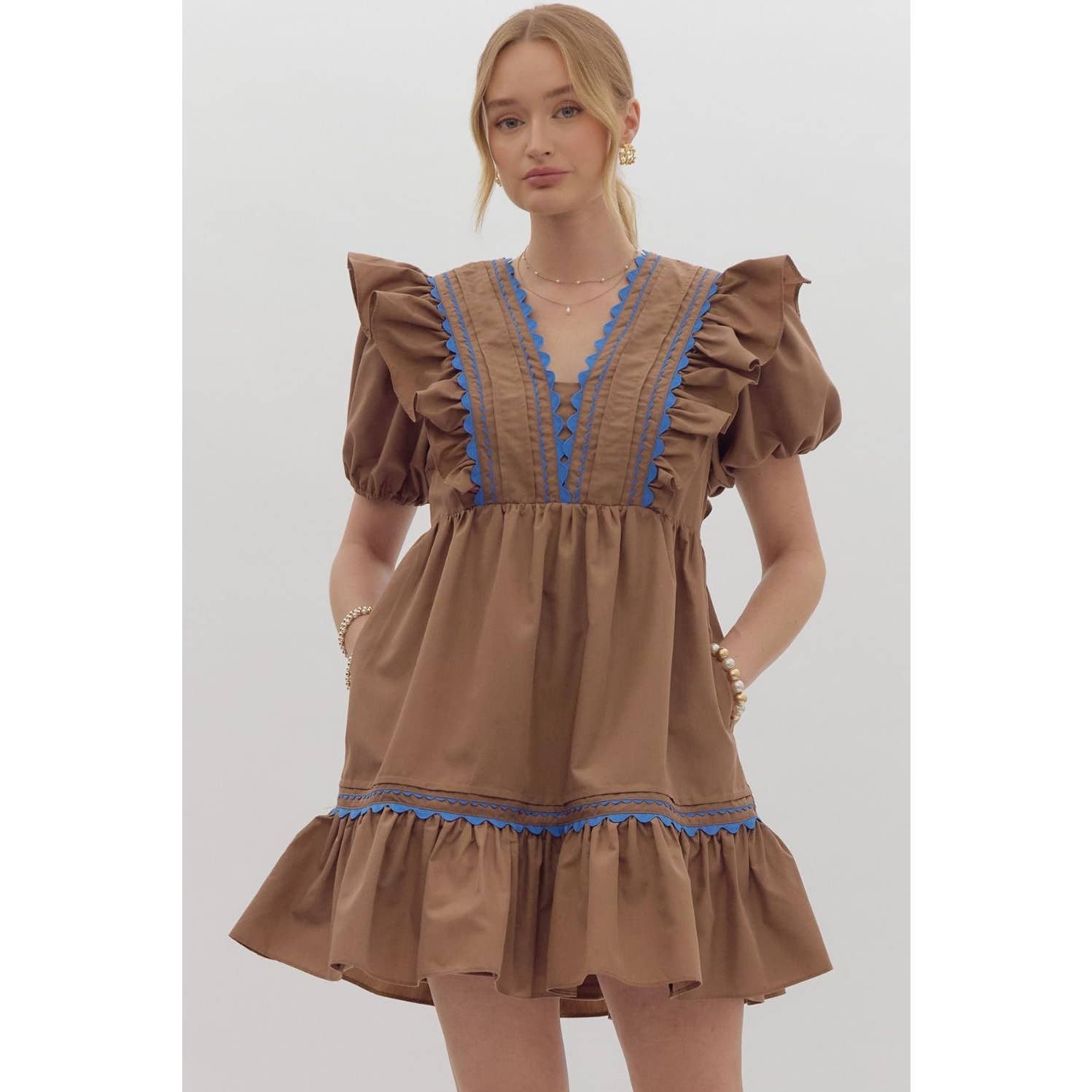 This Mocha Dress with Blue Scalloped Thread is perfect for any occasion! The solid short puff sleeves and v-neck add a touch of playfulness, while the ruffled mini dress design and pockets provide functionality. The contrasting scalloped trim detail adds a unique touch to this lightweight, non-sheer dress. Get ready to turn heads with this fun and flirty piece!