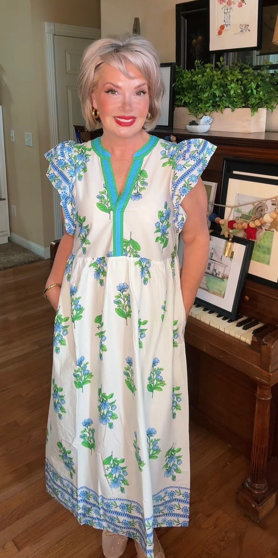Embrace Southern elegance with our Floral Print Midi Dress. The framed border and flutter sleeve add a touch of femininity, while the split neck offers a sophisticated detail. Perfect for any occasion, this dress is a must-have for your wardrobe.