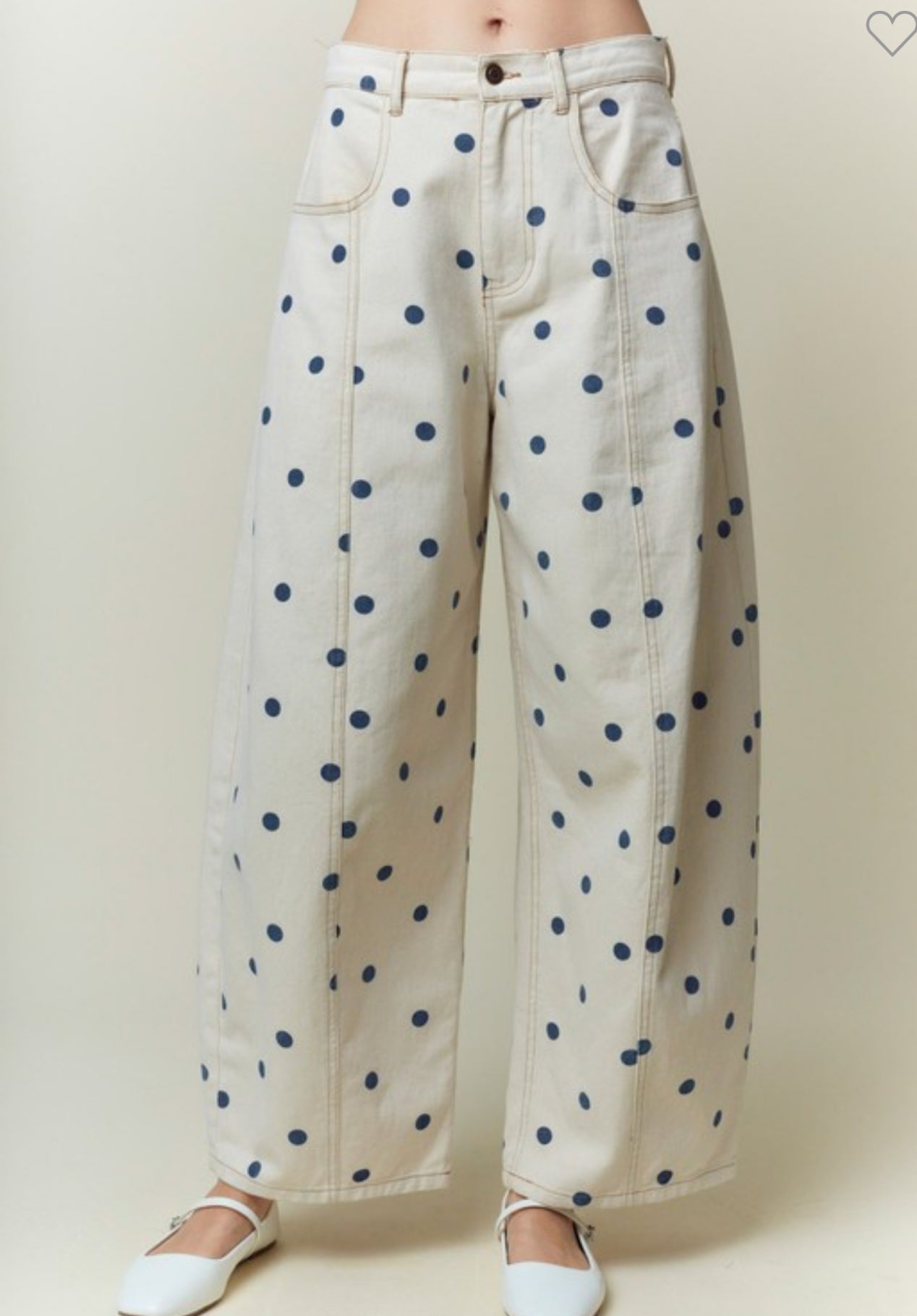 Elevate your fashion game with our Polka Dot Barrell Jeans. Made with a classic polka dot pattern, these jeans bring a fun and stylish twist to any outfit. Crafted with quality materials, these jeans provide both comfort and style. Perfect for any occasion, these jeans are a must-have addition to your wardrobe.