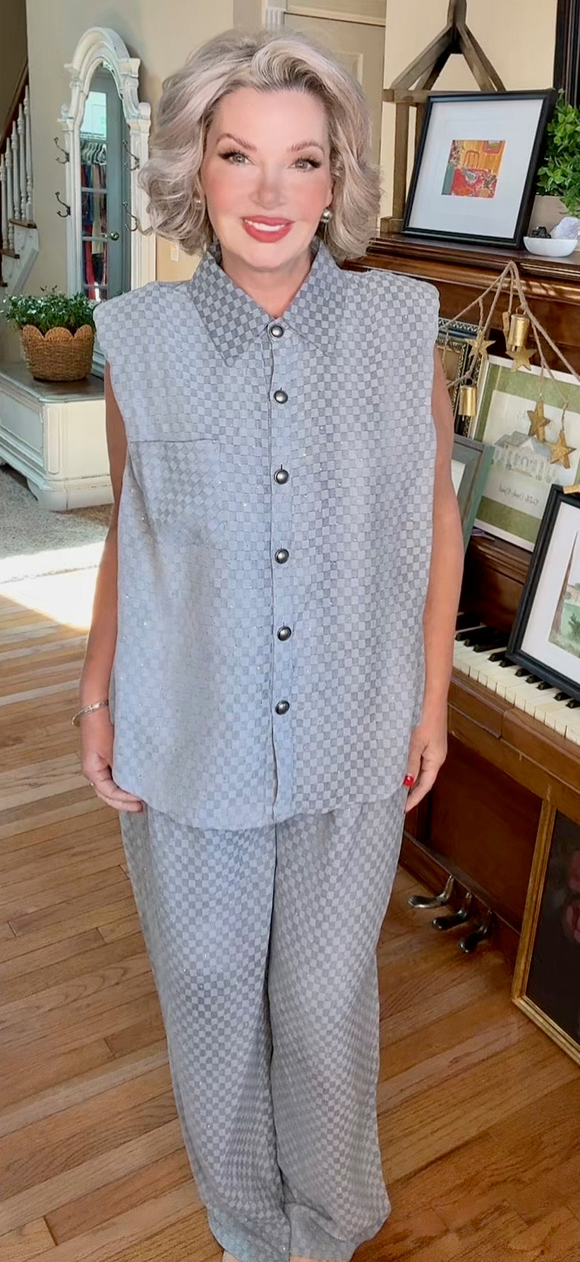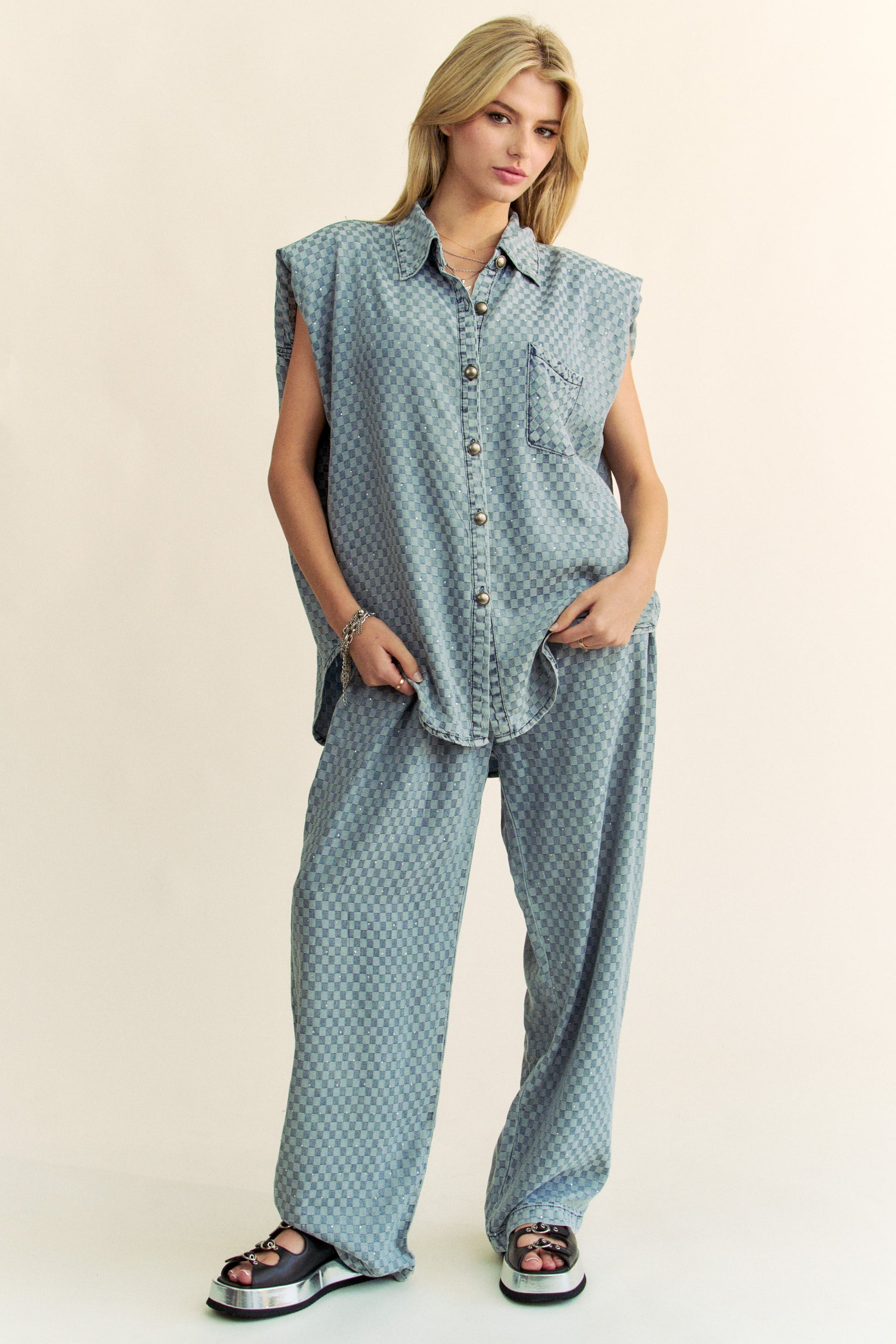 Unleash your playful side with our Super Soft Rhinestone Embellished Set! This set includes a chic CHECKERED DENIM SLEEVELESS BUTTON-DOWN SHIRT and comfy LONG PANTS for a stylish and comfortable look. Add some sparkle to your wardrobe with rhinestone embellishments, perfect for any occasion. (Note: These pants are as soft as a cloud, but way more stylish!)