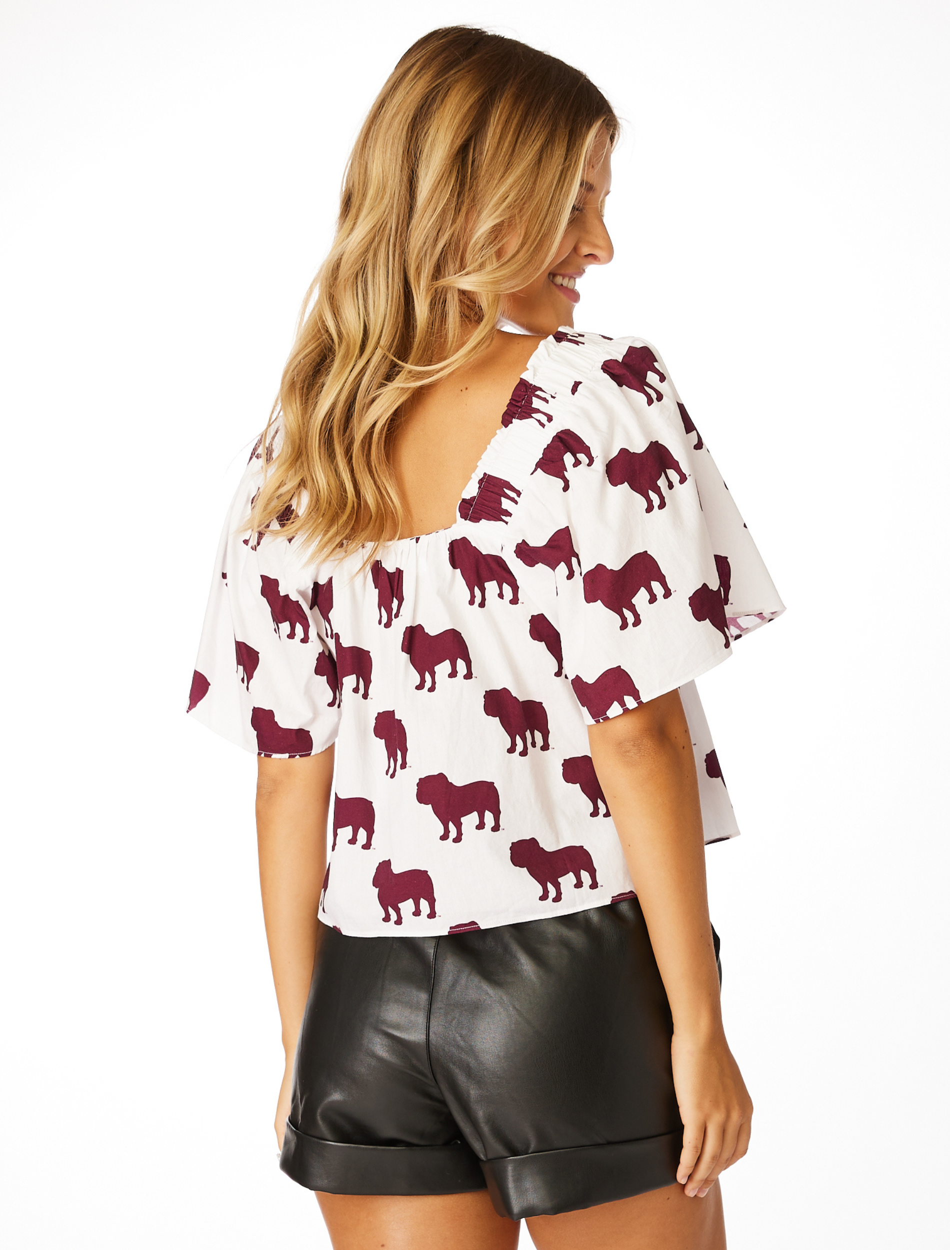The Poplin Accent Sleeve features a square neckline with lightweight puff sleeves, a loose body, and slightly cropped length. The all over school design will win the game for sure! Pair this with our matching Poplin Shorts or your favorite high-waisted jeans for a winning look! This shirt is officially licensed by Mississippi State University.