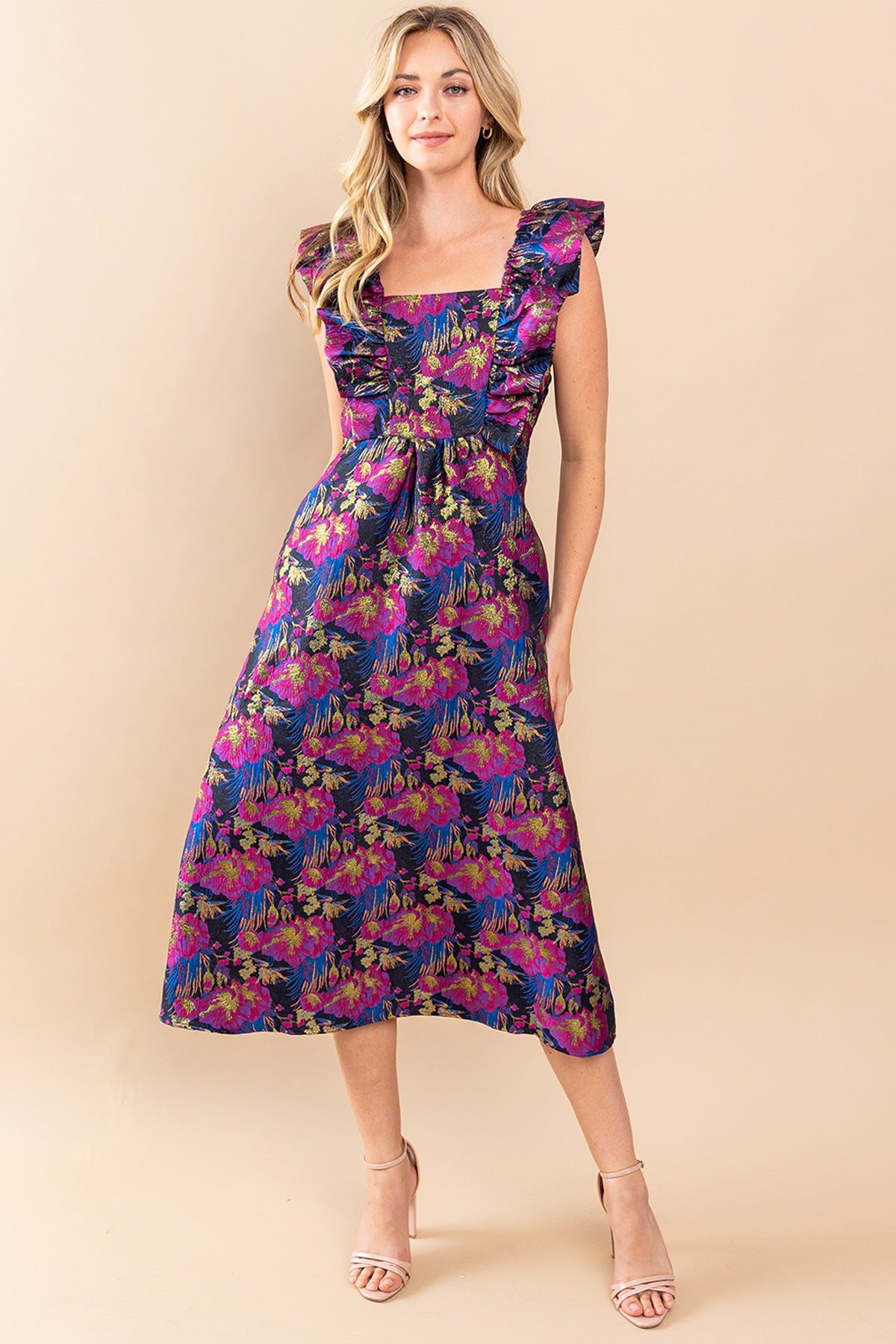 Look stunning in The Maggie Dress! This beautiful midi features a metallic navy and purple design with a bow and puff sleeves that will make you shine. Be the center of attention at your next event in this classy and elegant piece.